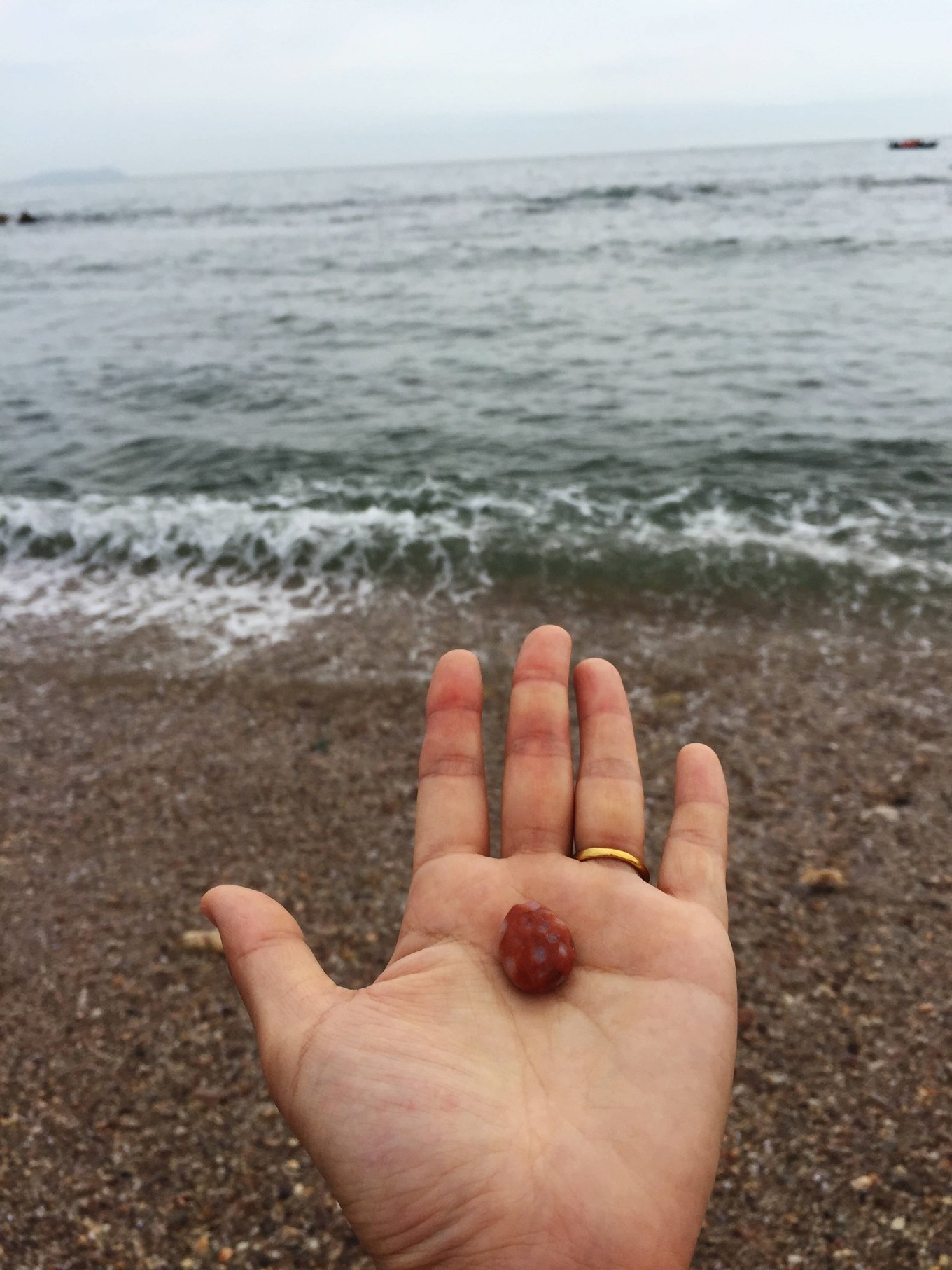 中轉(zhuǎn)的小船,停在海中心。在這里休息一會兒,等捕蟹船來接人去拔蟹籠。