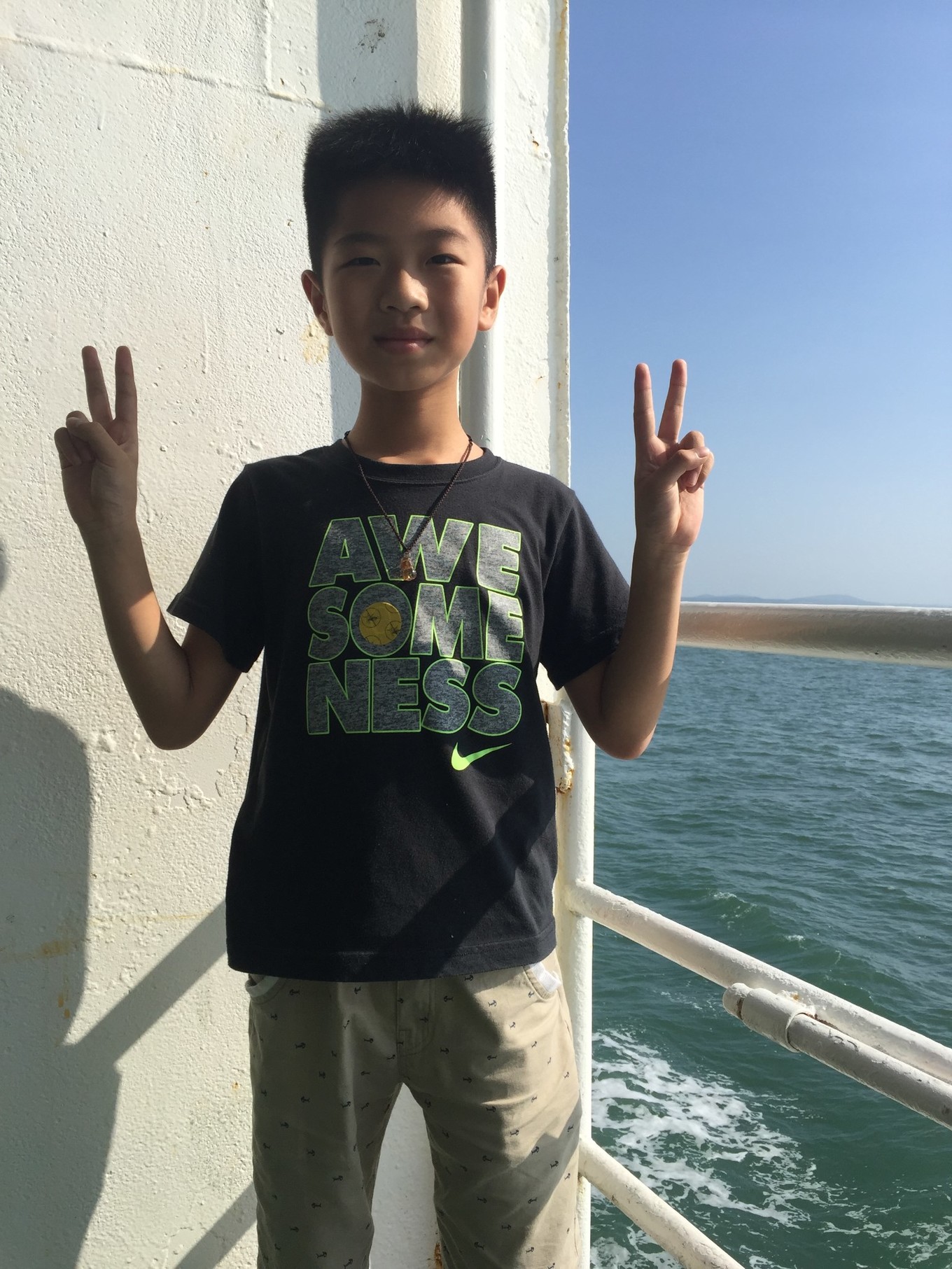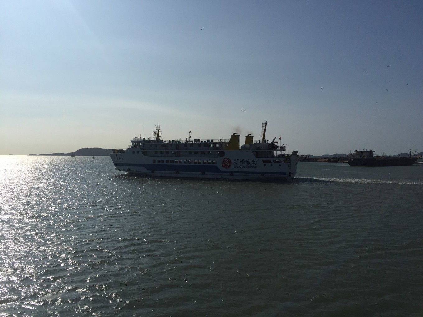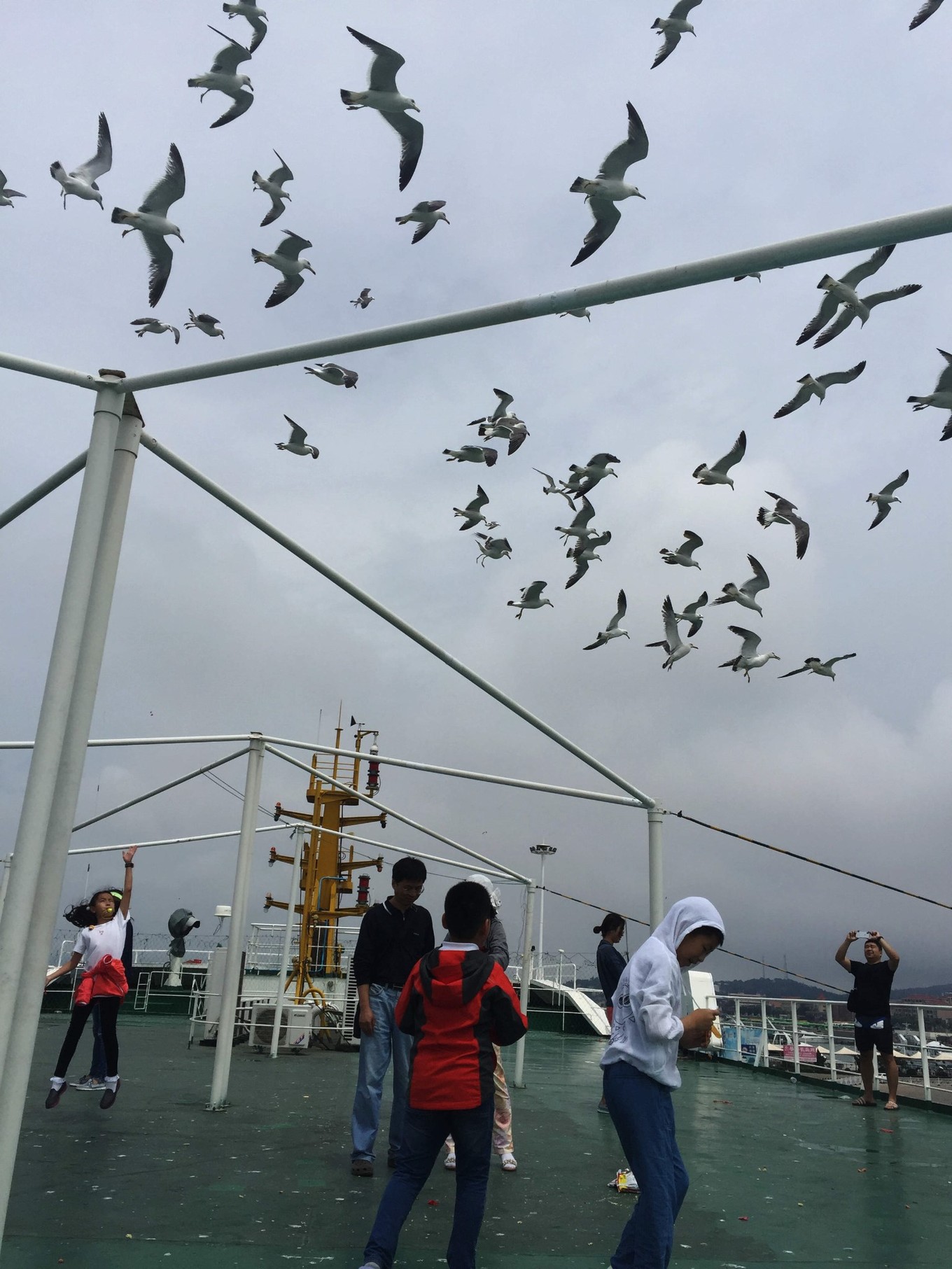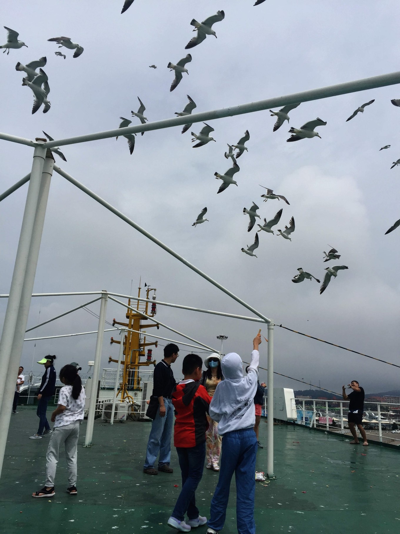 船上可以選擇花錢升艙,到船頂喂海鷗,20元/人。上島的時候沒上去,之后在離島的客船上,讓孩子感受了一下。