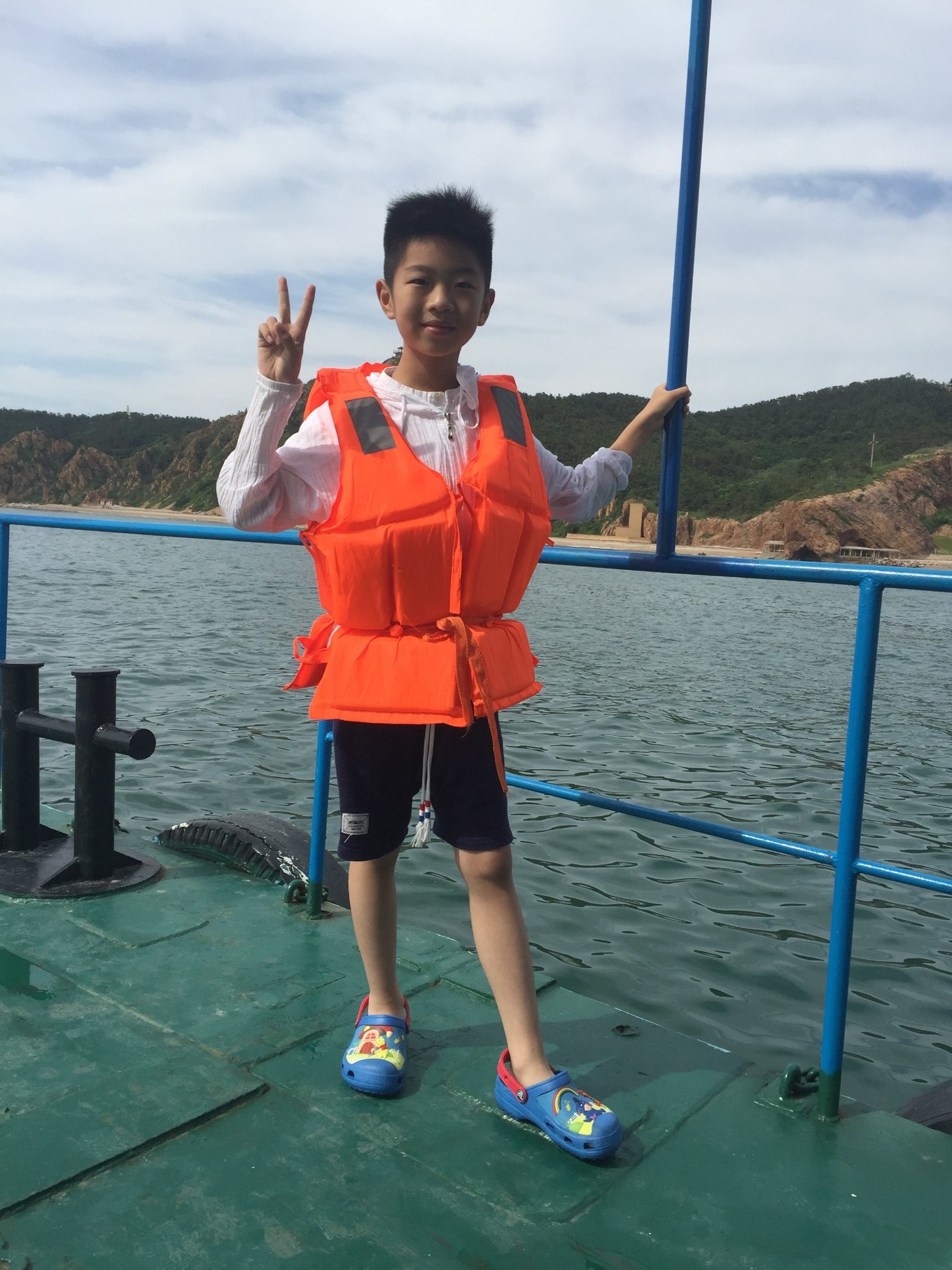 主要活動是坐快艇、看黃海渤海分界線、拔蟹籠,兒子很期待,1.2以下的孩子不能參加,1.2以上的就按成人收費(fèi)。