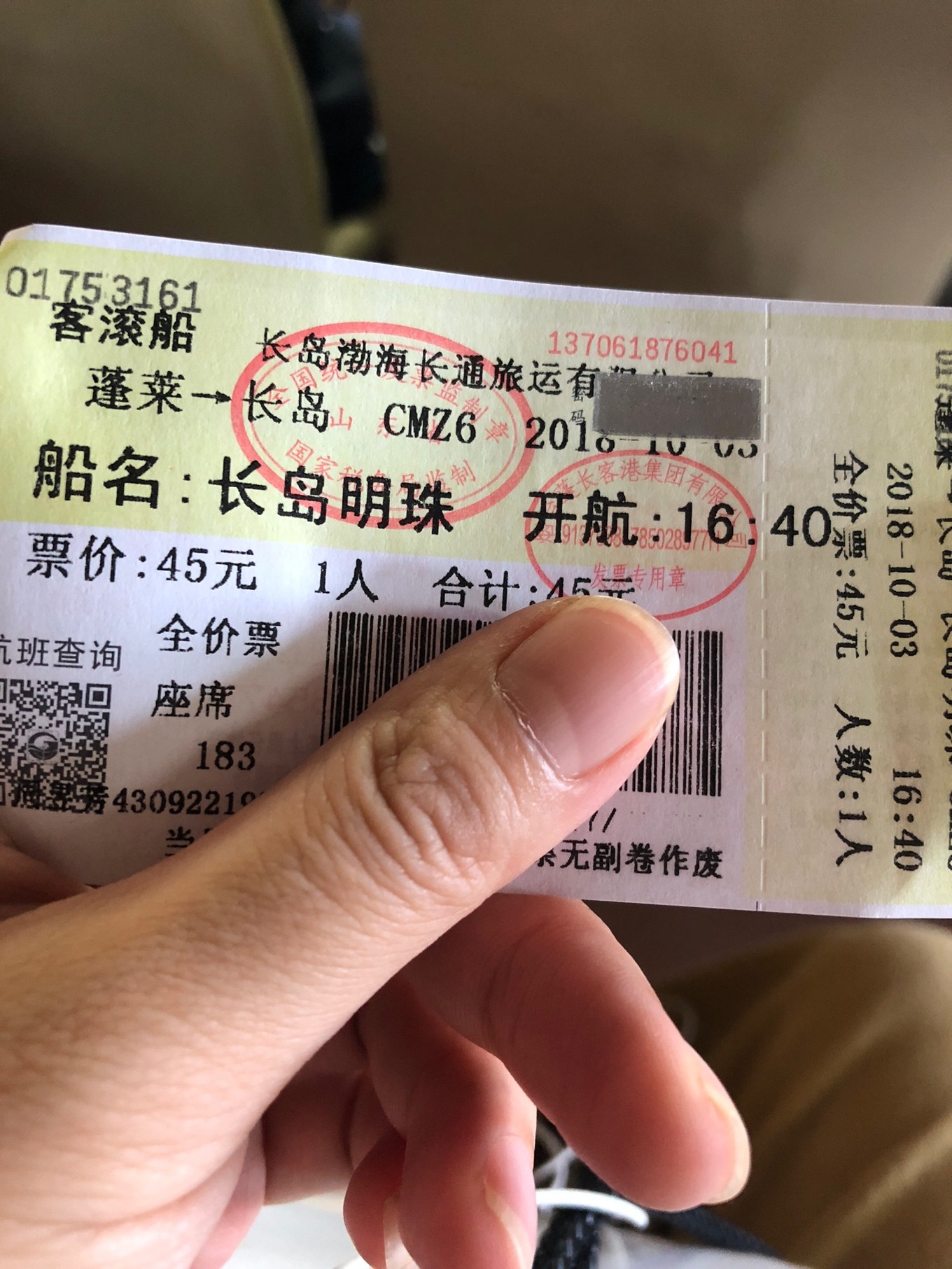 三十多分鐘大巴到了蓬萊客運站,根據(jù)機場大巴工作人員說的蓬長客運港只有兩公里,必須步行。然鵝我開導航發(fā)現(xiàn)有將近五公里,好吧,出站都是的士拉客,本人一向不喜歡這種車子,當然其實是怕被宰,哈哈哈哈,出手攔了一輛的士,司機上車仍然一口價,說平時25,今天30吧,無奈先走了再說吧,順利到港,人已經(jīng)不多了,買到4點40的船票,票價45,出發(fā)吧…(按照司機的說法,國慶這幾天上午基本沿路都非常堵,倒是下午三四點會順利很多,暗自慶幸自己的選擇)