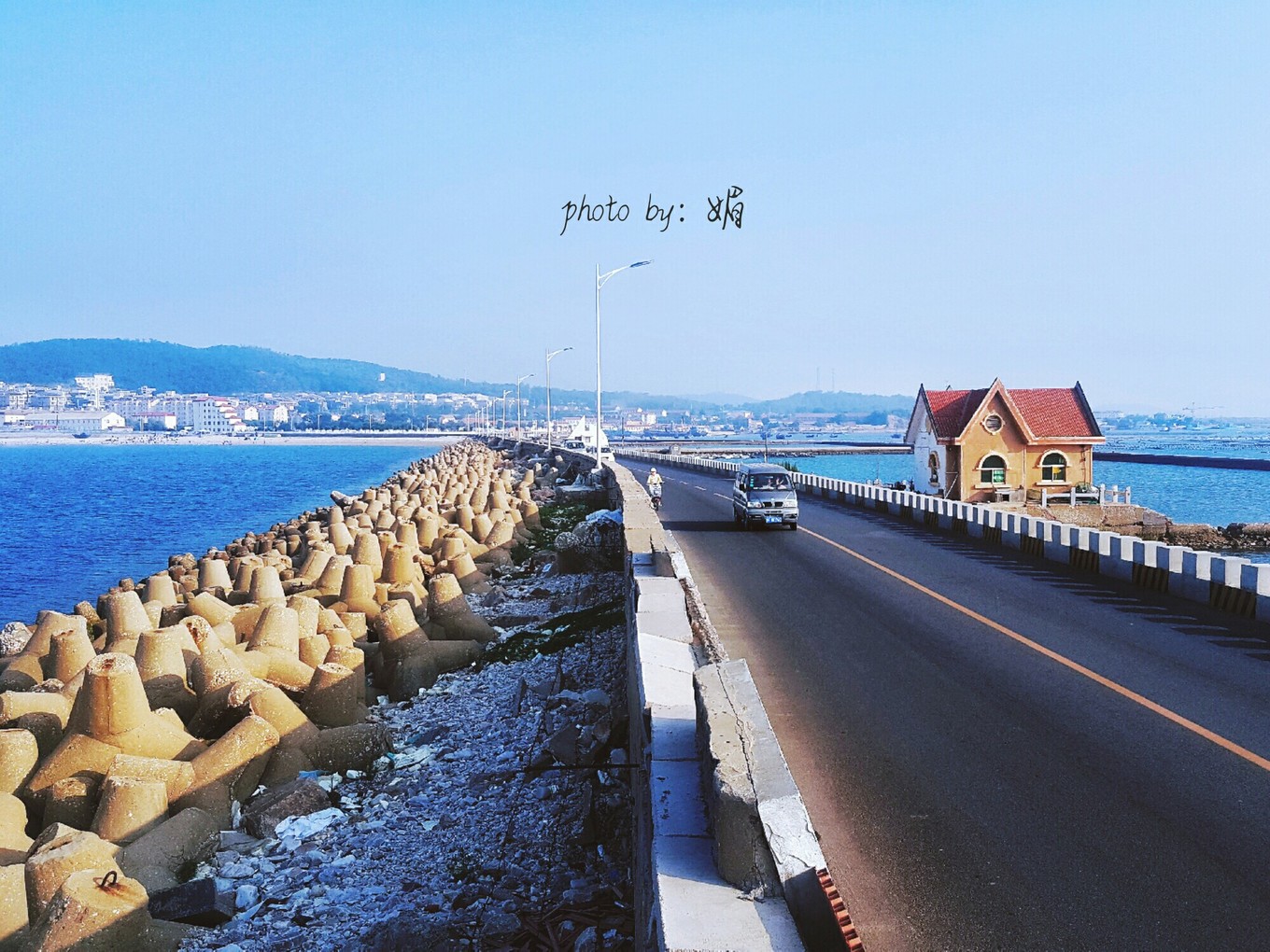 下圖為南北島之間的舊路,前方有一片海灘,左側(cè)有一架新橋,右側(cè)是飼養(yǎng)海參的海域,嗯,我站在旁邊的路基上,危險(xiǎn)動(dòng)作請(qǐng)勿模仿。。。