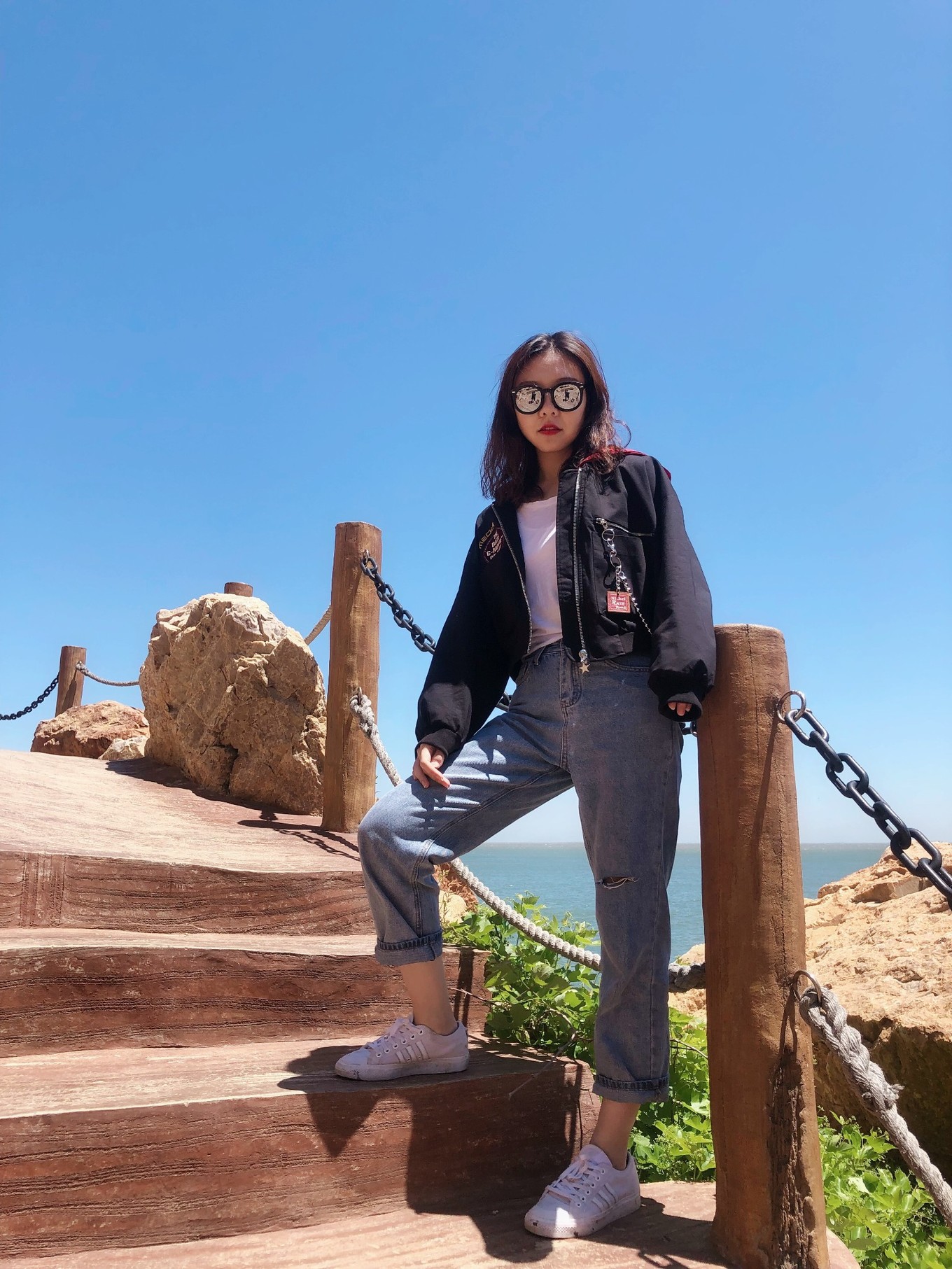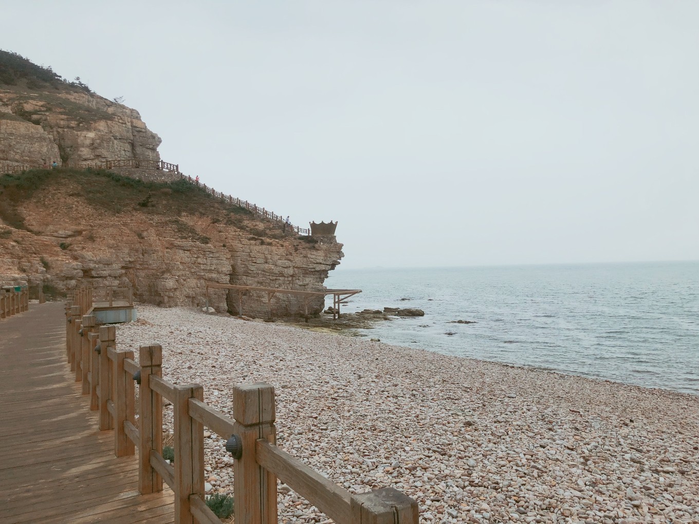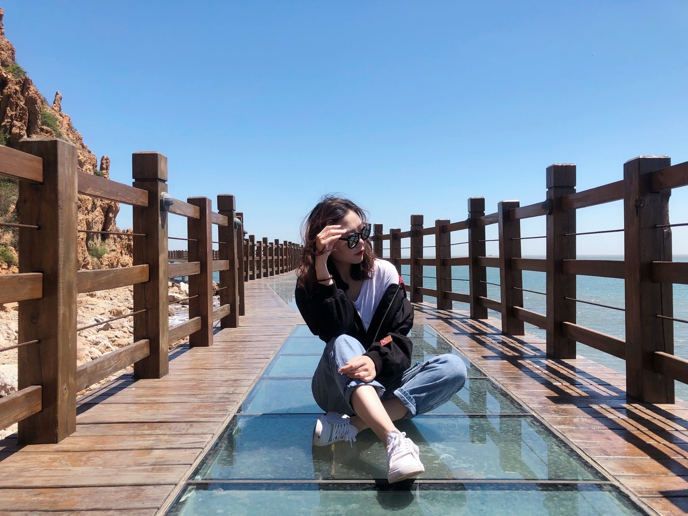 這片沙灘上去就是棧道,中間有一節(jié)是玻璃棧道,可以透過腳下的玻璃看到海水拍打巖石。