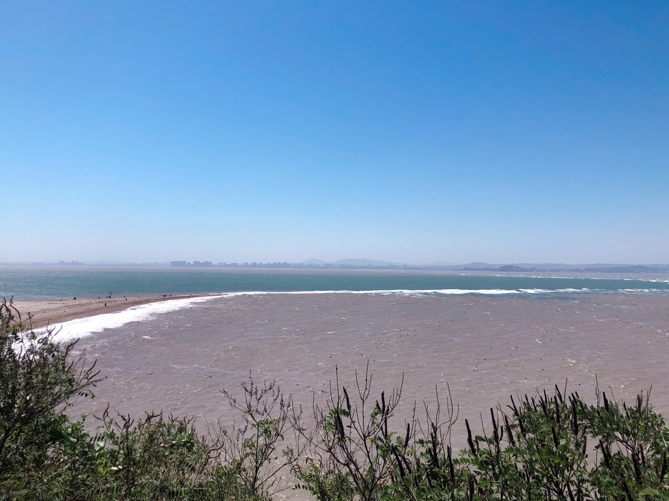 黃渤海分界線前有一大片沙灘,浪很高,黃海和渤海顏色分明,真的非常清晰。
