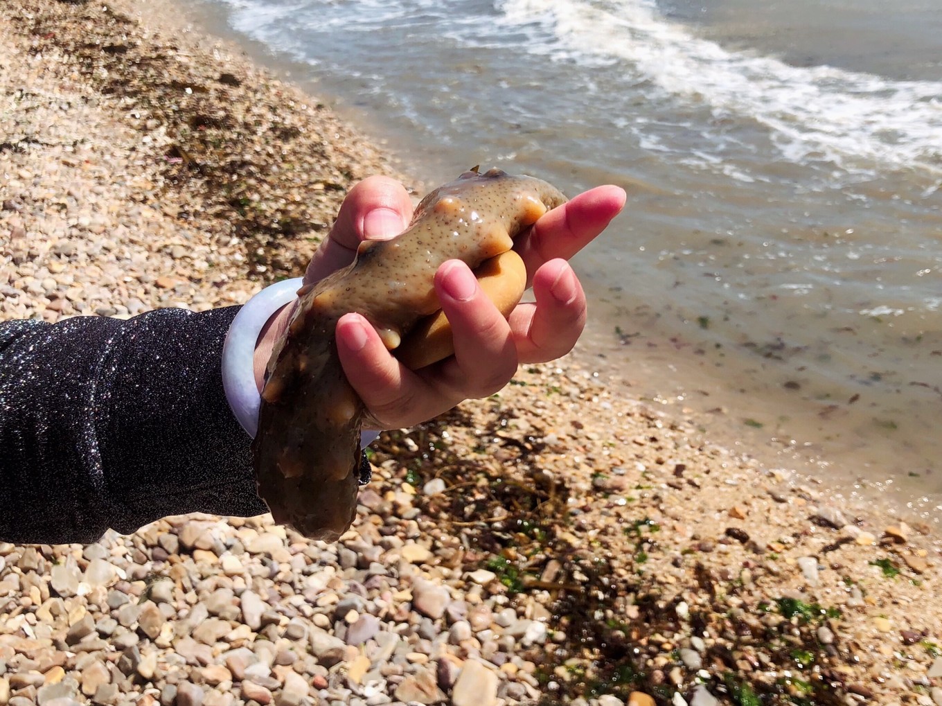 一個游客大姐的老公抓了一條巨大的海參,好羨慕~后來在烽山又碰到了這個大姐,她說他們一共撿到6條海參,當?shù)厝硕奸_始趕他們走了