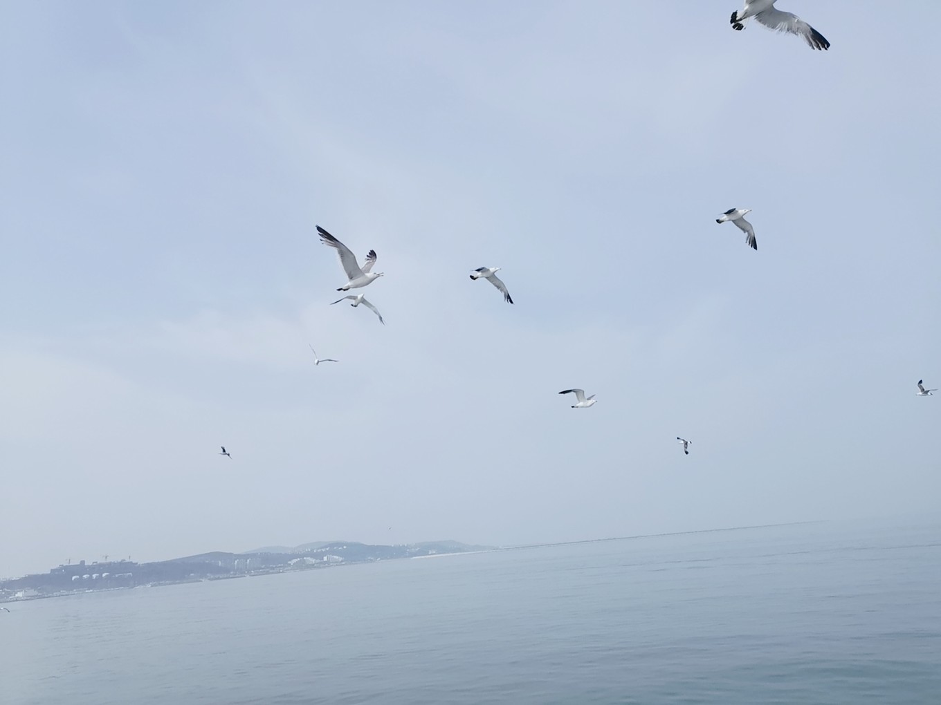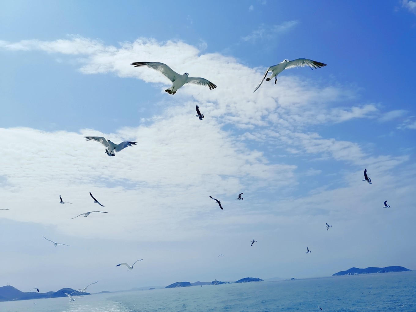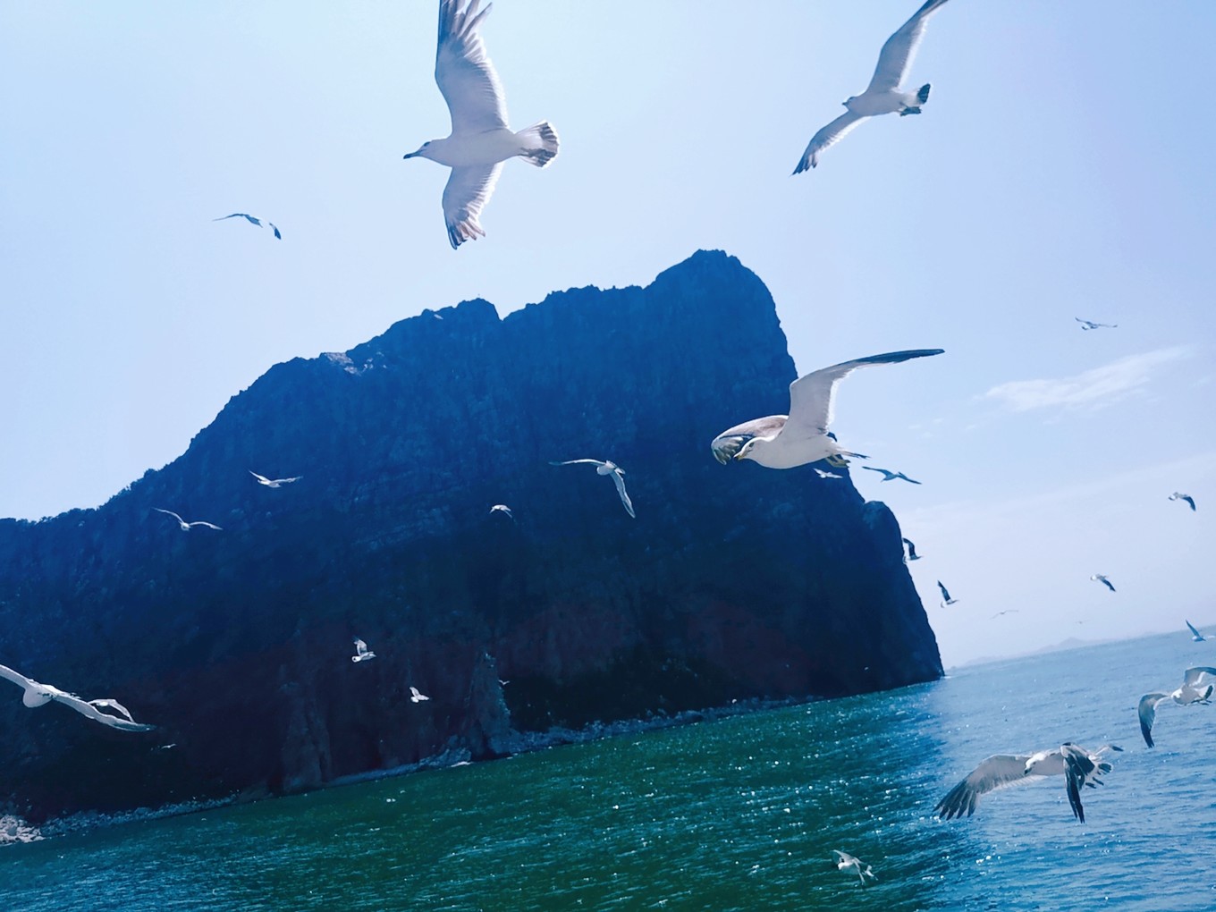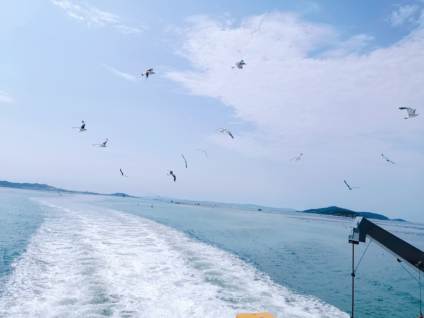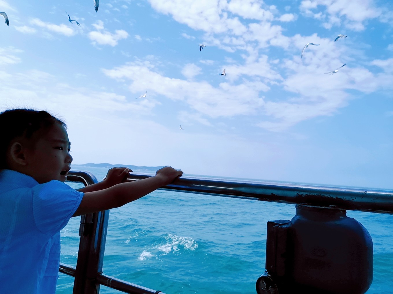 就要離開長島了,登上了客船,大群的海鷗仿佛在為我們送別。