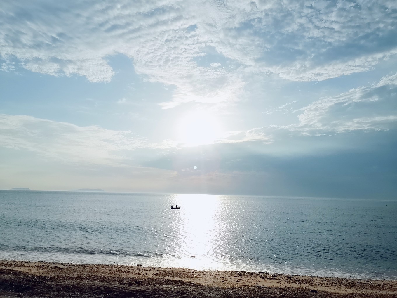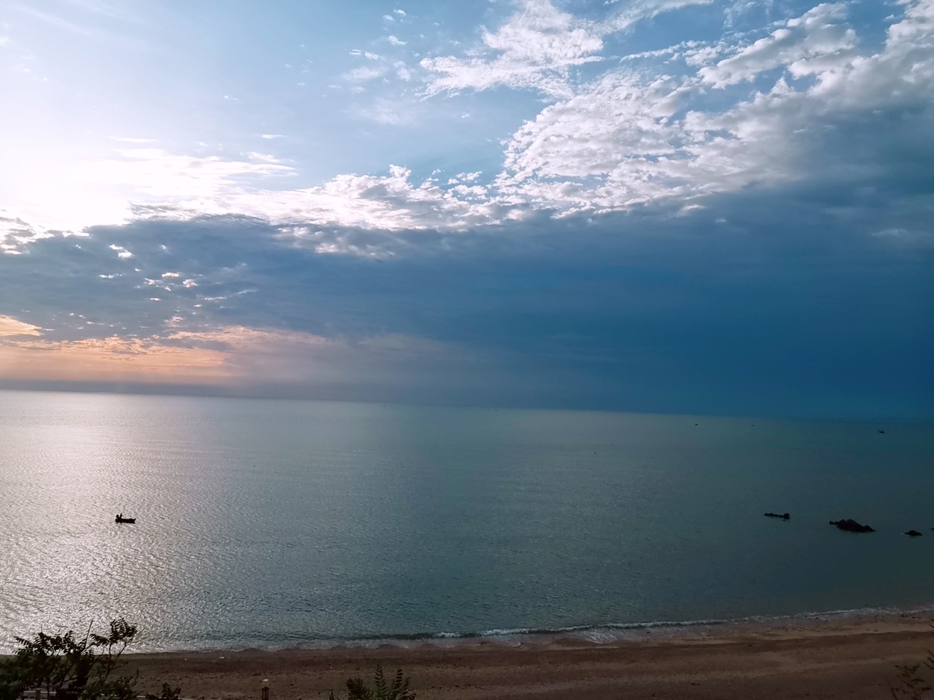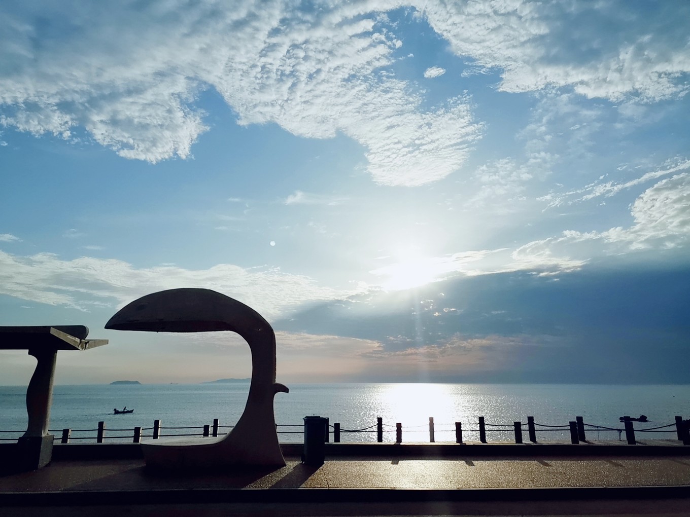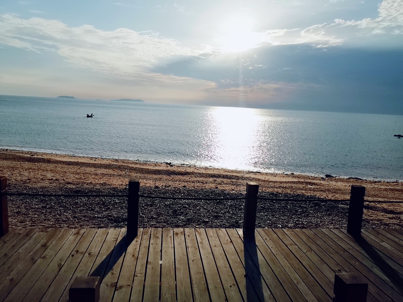 看著太陽慢慢展出笑臉,海水波光粼粼,一艘孤舟踏水而過,多么像畫卷中的顏色。