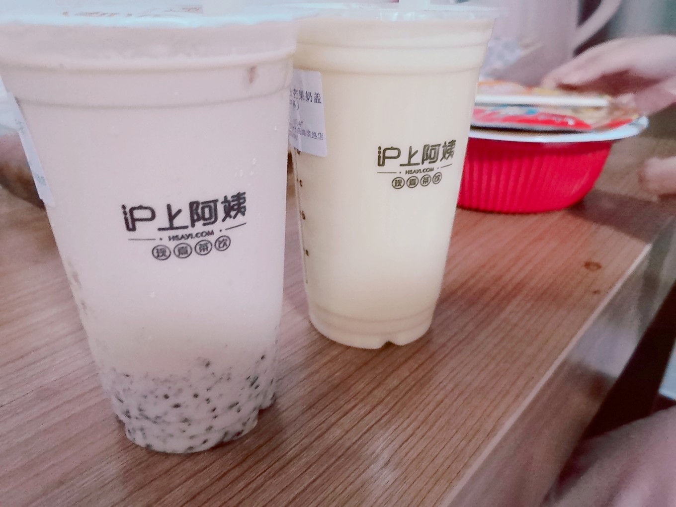 夜晚時,趁雨停了一會兒去買了兩杯滬上阿姨,血糯米奶茶,芝士芒果雪蓋,一會的功夫雨又淅瀝瀝地下起來了。