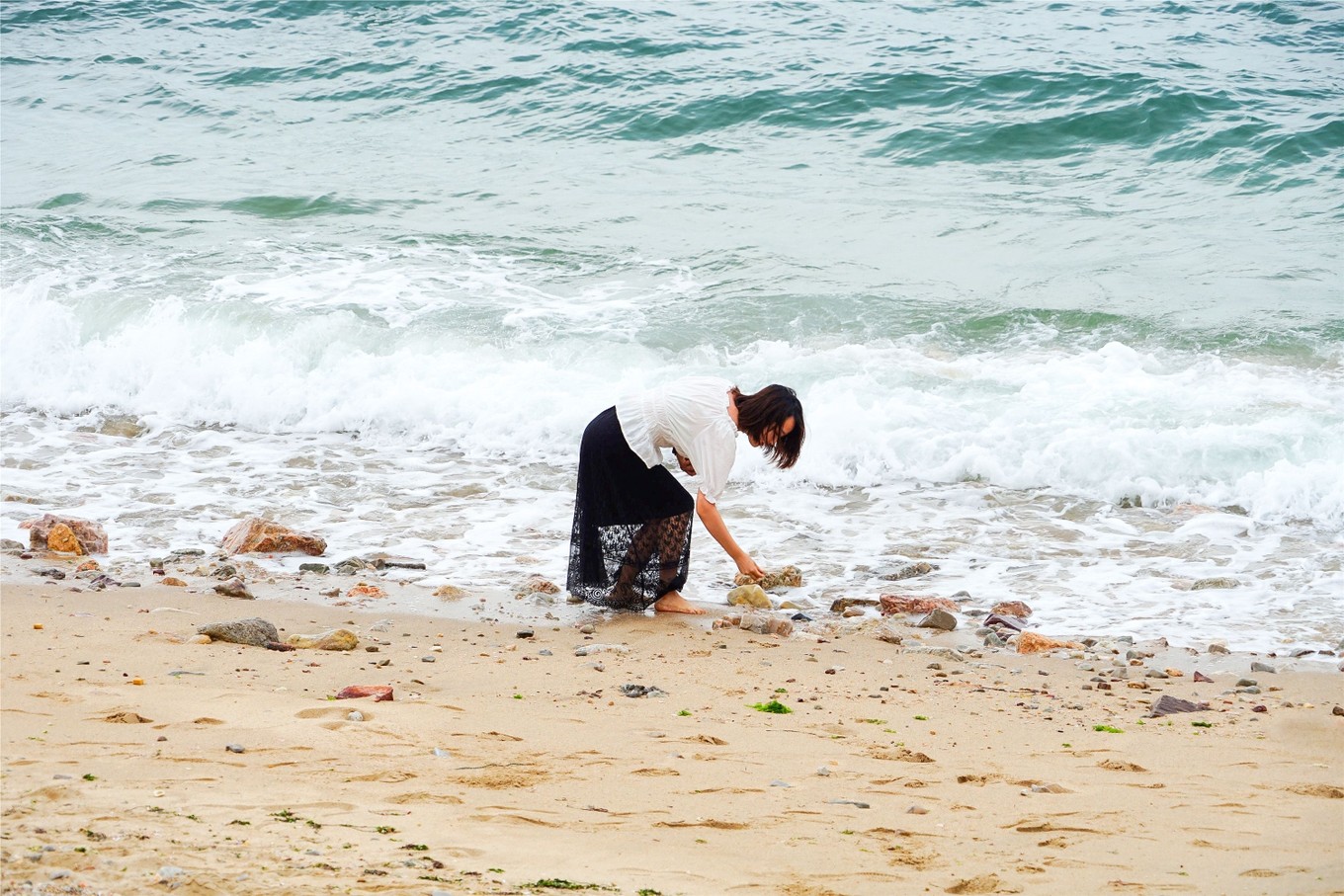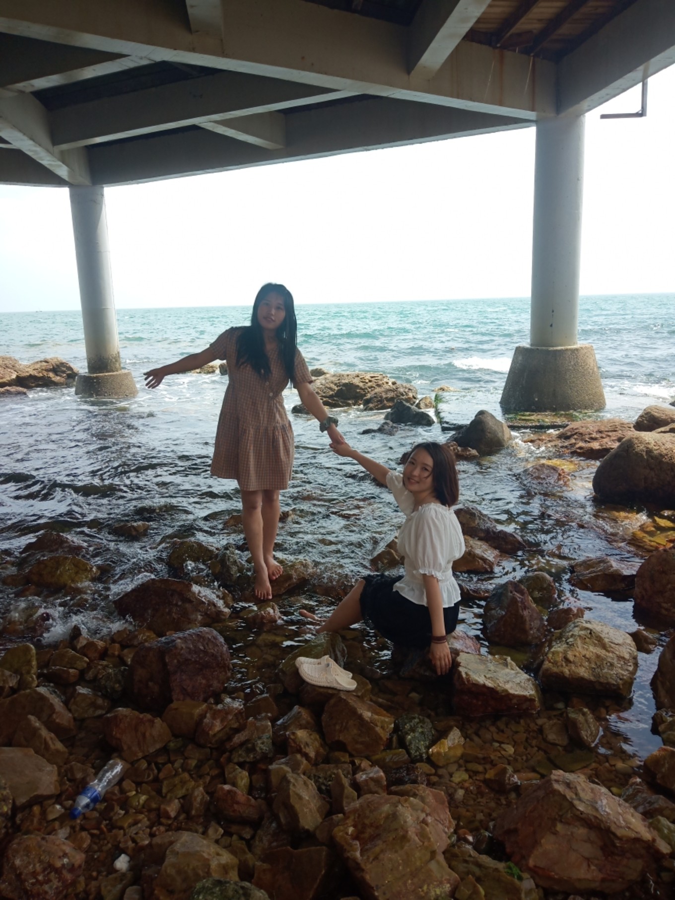撿石頭的時(shí)候,沒注意到岸上有人給我們拍照,可能在海邊光腳撿石頭的女孩子,也算是一處風(fēng)景吧,拍出來的照片還挺好看的。