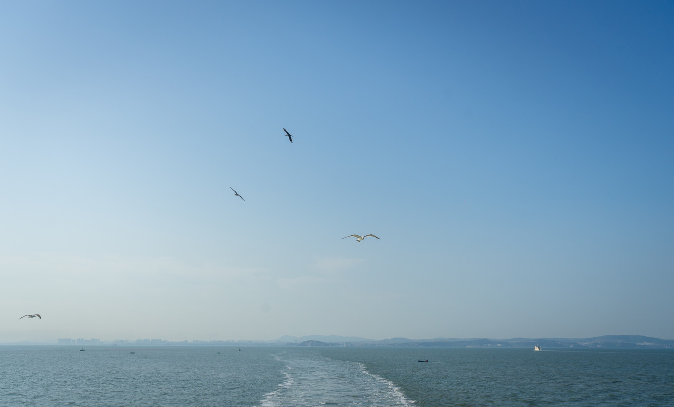 生平第一次,在夏日里看到海鷗。在青島的棧橋邊看過海鷗的飛舞,在冬日。在云南的滇池旁見到過海鷗的英姿,在初春。夏日的海鷗更活潑好動,揮動著翅膀與客船共同前進。