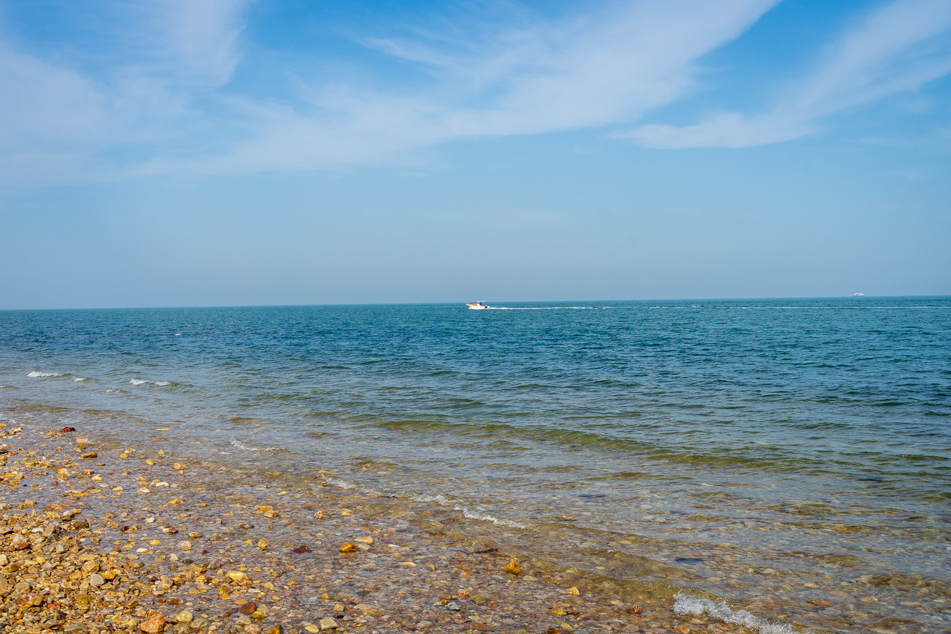 天氣好的不像話,跟同行的朋友感慨,怎樣的壞心情,到了這樣的天氣里,總能晾曬干凈,變得干燥而溫熱。紅色的小船快速的駛過,將這大片藍色點亮。
