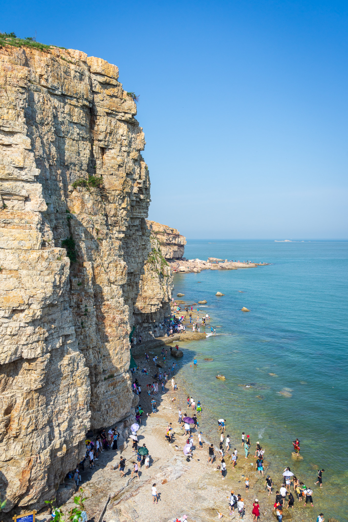 在一望無際的大海旁,是狹窄的礁石與砂石灘,而另一側,便是直立的巖壁,高約70米,巖壁垂直陡峭,有些地方都高于90度。自詡不怕高的我,早在幾年前還夜爬過華山??筛┮曔@巖壁,還是忍不住心里發(fā)虛,可想若是在海邊抬頭仰望,這巖壁該是多么高大雄壯的奇觀。