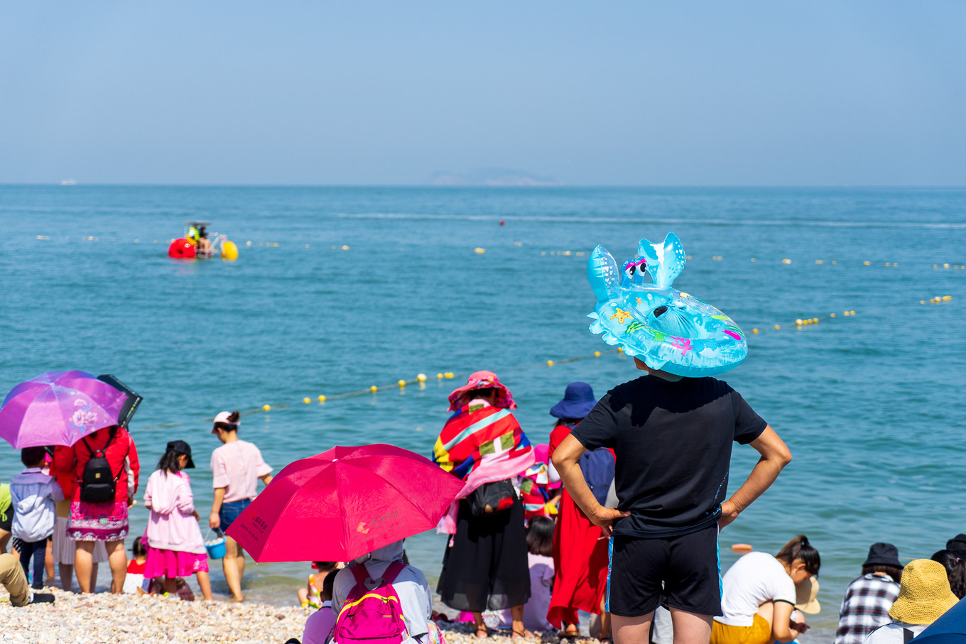 拿著相機瞎溜達拍照,偶然瞥見,有游客把螃蟹狀的游泳圈套在頭上,當遮陽帽。游泳圈萌萌的,一看就是搶了自己家娃兒的游泳工具,這反差萌生生把我逗樂了哈哈。