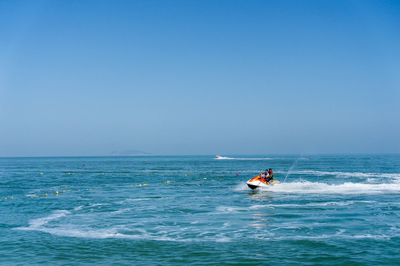 上午10點多,日光開始灼熱起來。有游客騎上摩托艇,到海中與這碧水近距離接觸,濺起水花陣陣。在岸邊看海,與駛在海上,一定是兩種完全不同的感受。
