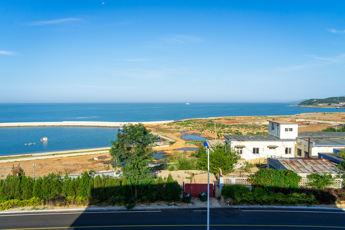 而準備啟程返家的清晨,晨起7點鐘,還有建筑的影子落在前方,光明與陰暗在眼前交匯,更遠處,是早就明亮起來的土地,藍的醉人的海與天。海上零星飄著的漁船,像極了空中的繁星點點。