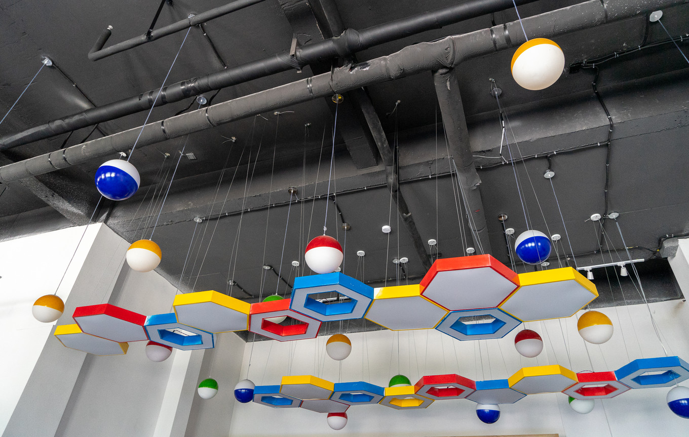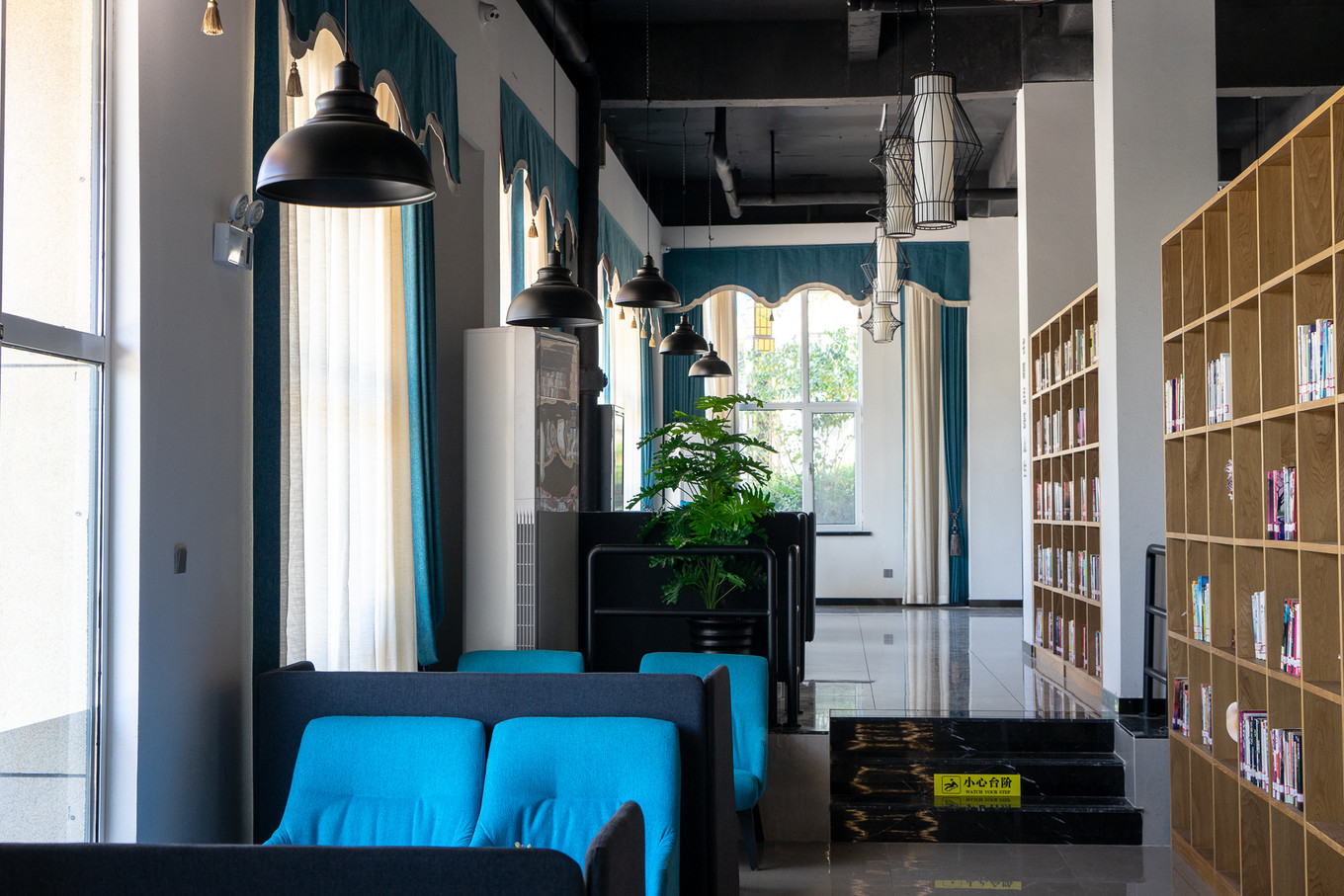 客棧的大廳也別具一格,天花板上垂下的五顏六色的點綴,讓大廳瞬間生動起來。休息區(qū)的書架上擺滿了書,選一本喜歡的書,坐在舒適柔軟的沙發(fā)上,再點一杯咖啡,若是不趕時間,這樣虛度時光的優(yōu)哉游哉,也是一個好選擇。