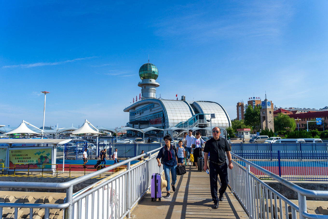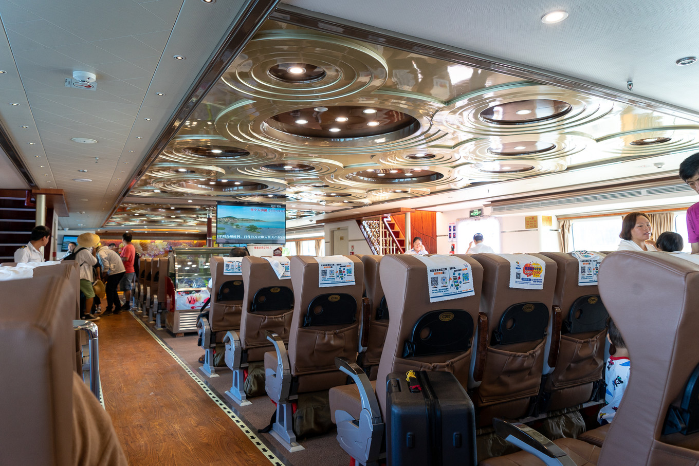 返程時買的船票是豪華客船,票價比普通客船略高,當然待遇也提升了。來時室外的硬邦邦冰冰涼的椅子,換成了裝飾考究的船艙內(nèi)的皮沙發(fā)。整艘船在行駛中也更加的穩(wěn)當,速度也略快。正玩兒著手機,被朋友提醒“到了”,我才回過神來,匆匆去提行李箱。