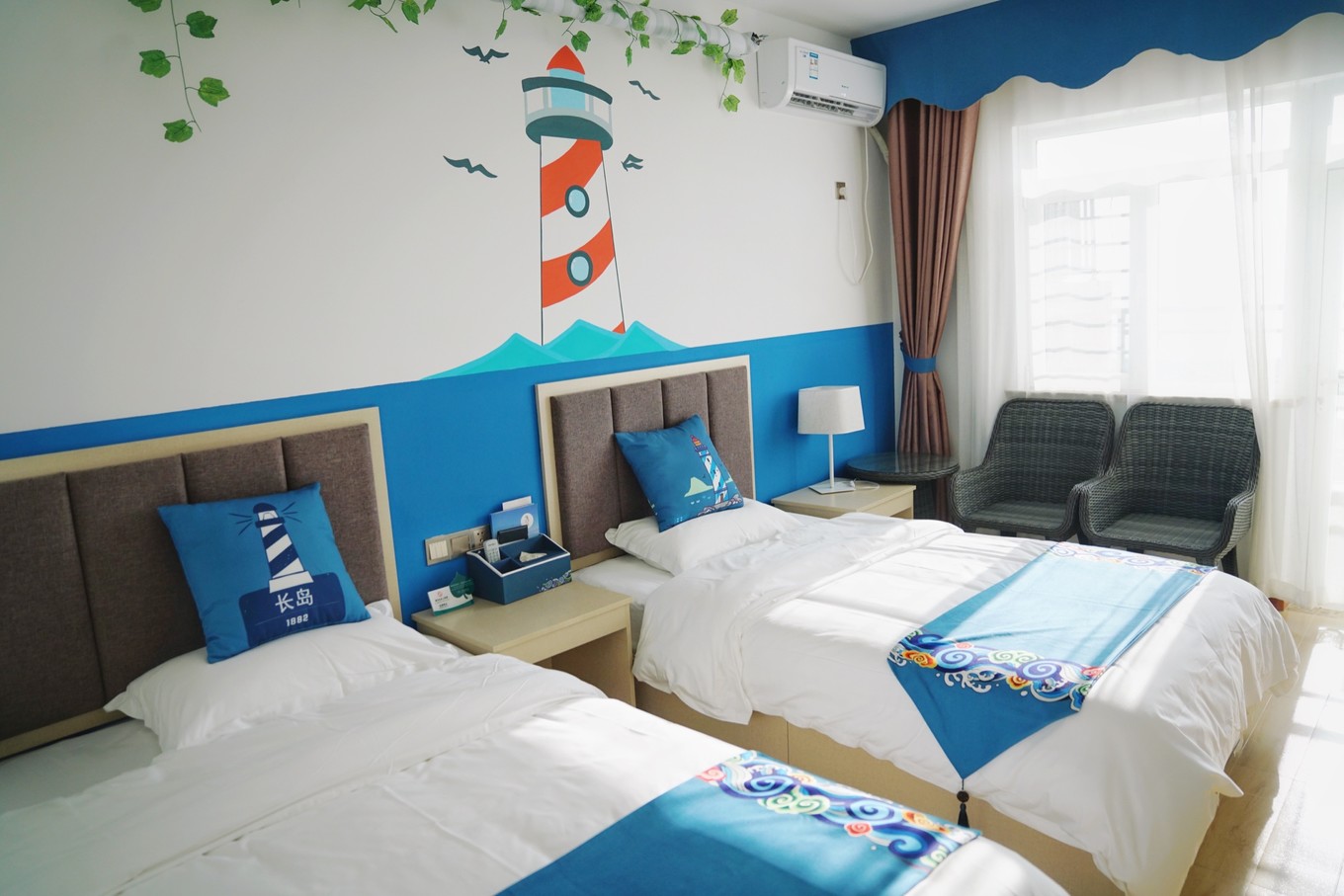 住在島上的漁號客棧,房間面積不大,勝在生動活潑,充滿海洋氣息。房間主色調(diào)為藍白亮色,燈塔、長島文字、海鷗等長島元素滲入到每個細節(jié)之中。