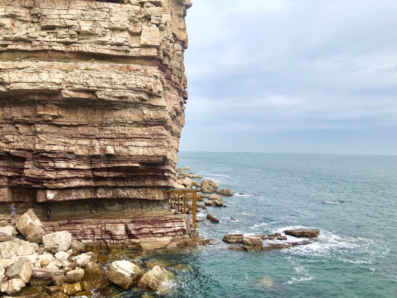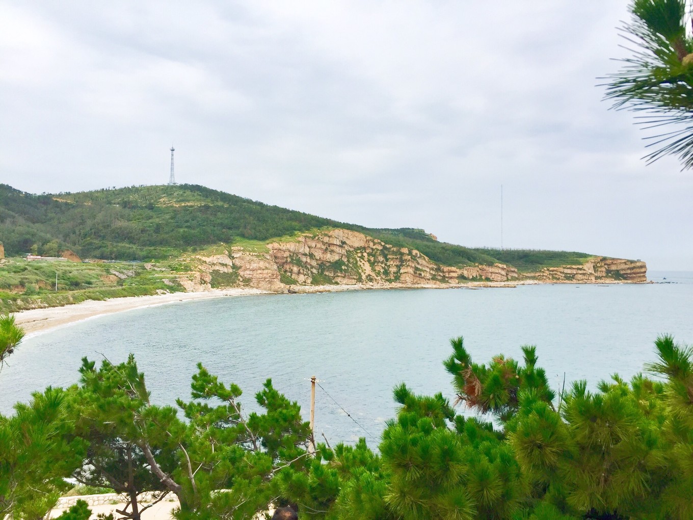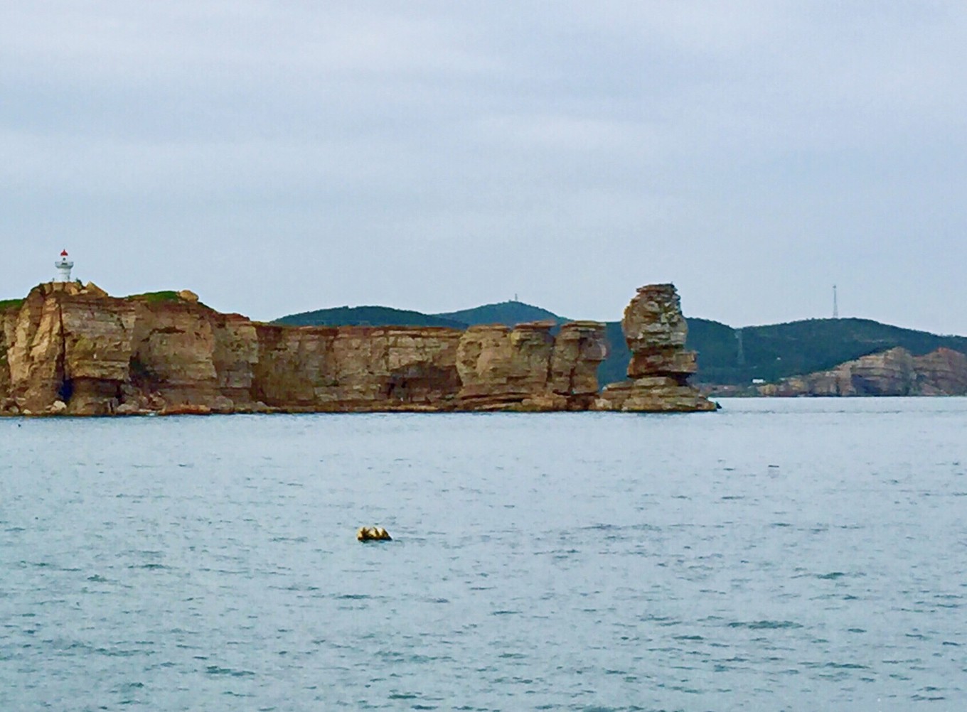 遠遠望去可見九丈崖上的燈塔和珍珠門遺址標志。