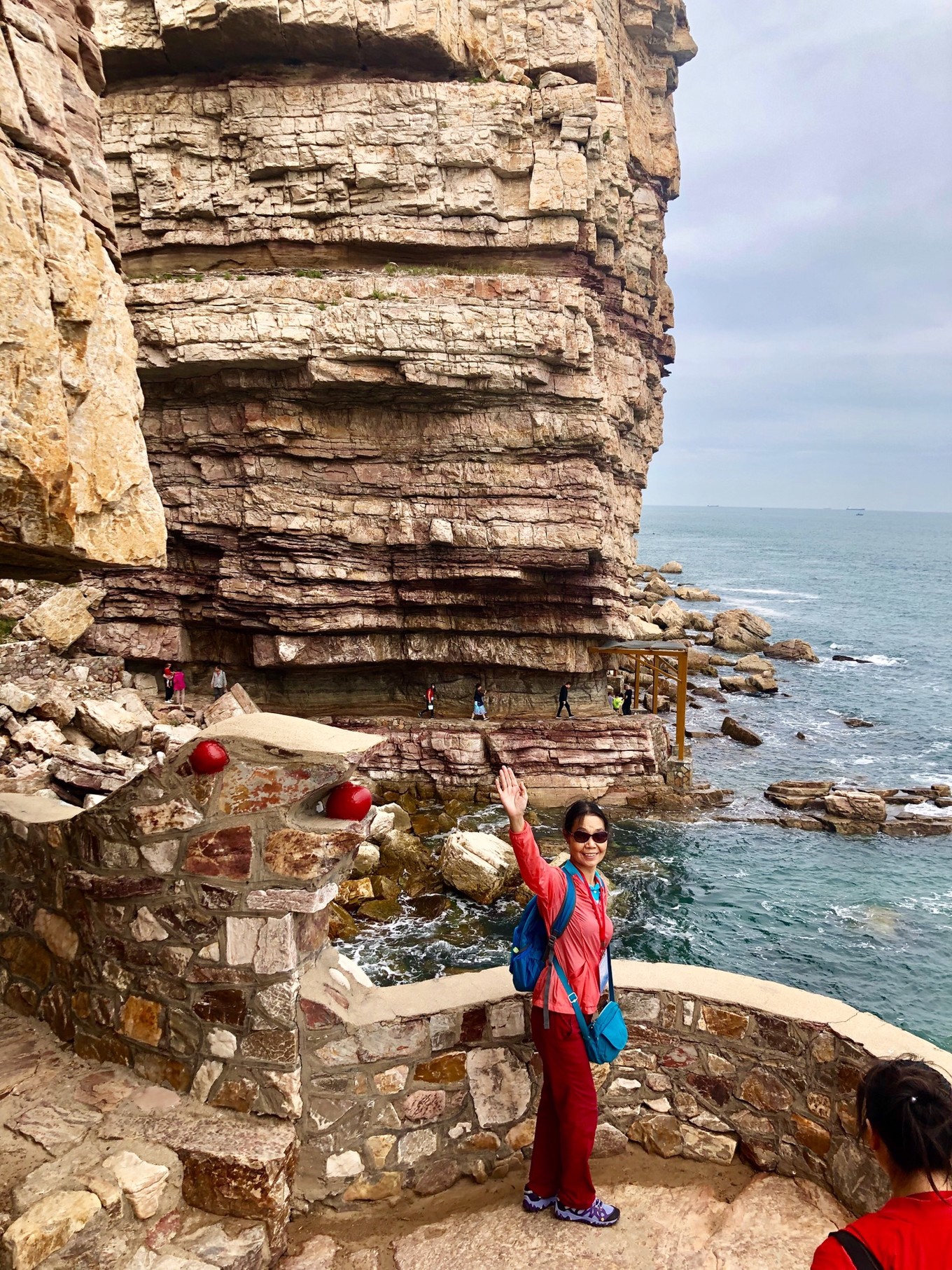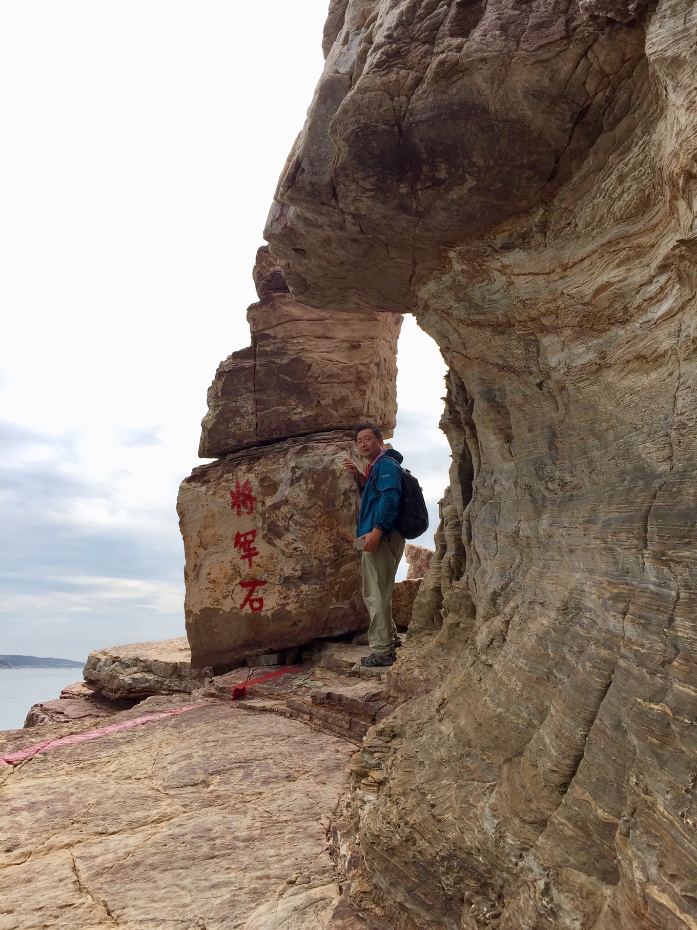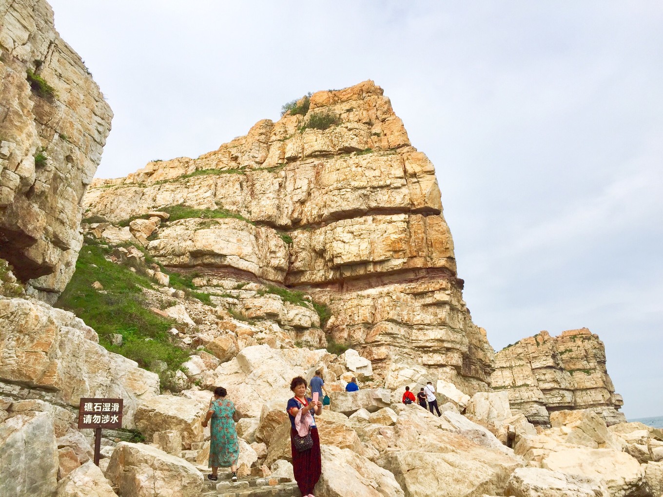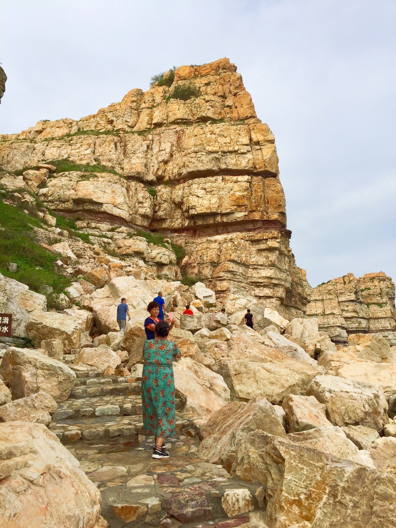 來長島前做了功課,島上游有二條線,一條陸地游,九丈崖、月亮灣、烽山林海、仙境源。另一條線路就是海上游,從長島乘游船前往萬鳥島,猴磯島,大黑山島,廟島等多條海上航線。不巧的是我們上島時,碰巧受臺風影響,海上游停運2天了,一般來說,海上陣風到達8級,游輪便停航。因此,我們調整了一下時間,9月11日先陸上游,上午玩九丈崖,月亮灣,中午回旅店休息1小時,下午在民宿旁邊的烽山林海公園游覽。如果9月12日海上游仍不開通,我們上午在仙境源轉轉,下午出島,幸運的是12日一大早,民宿老板告訴我們,今天游輪復航,于是立即決定趕最早的8點30分游船海上游。早餐后老板用車送我們來到碼頭。
