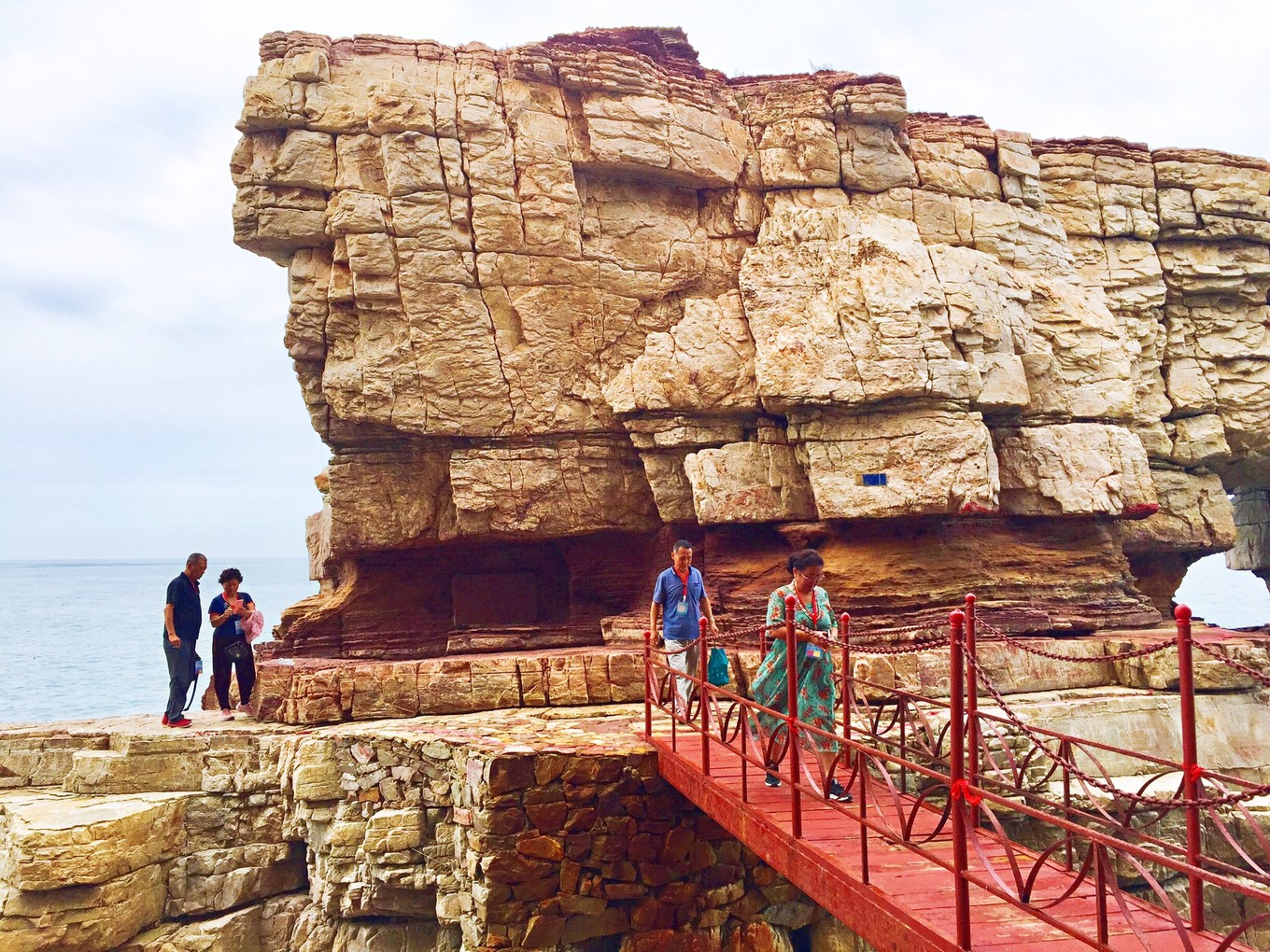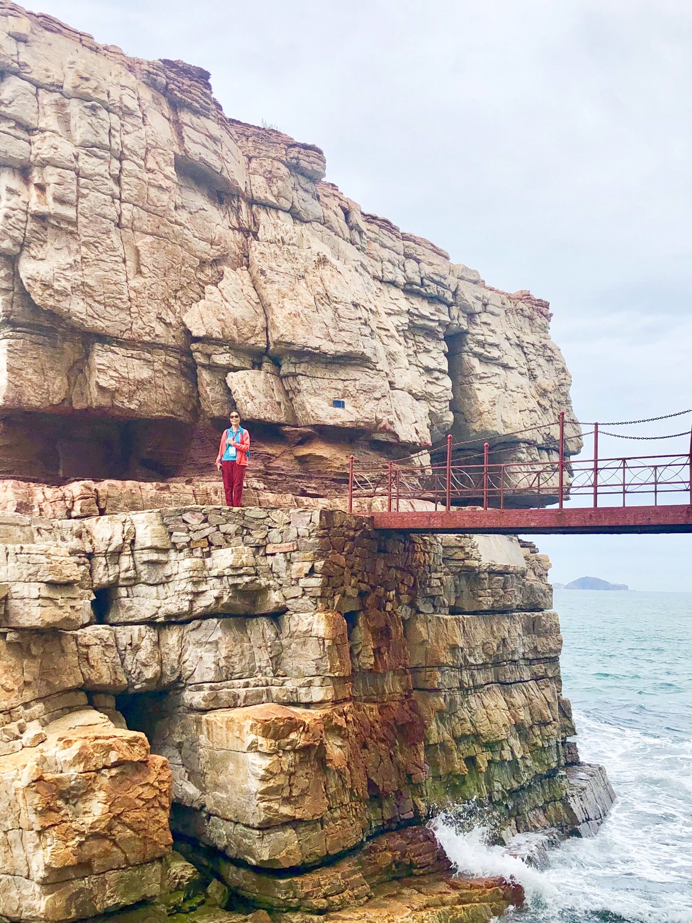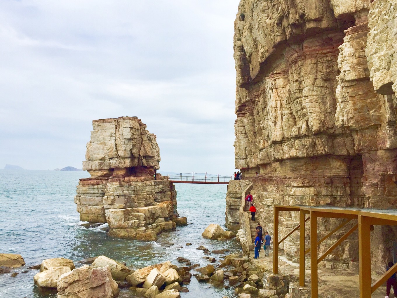 這塊樓宇一樣的巨礁,孤礁突起,四壁如刀砍斧削,極陡峭險峻,與海面呈九十度,通過鐵橋與主島相連。當?shù)厝朔Q之為石樓。