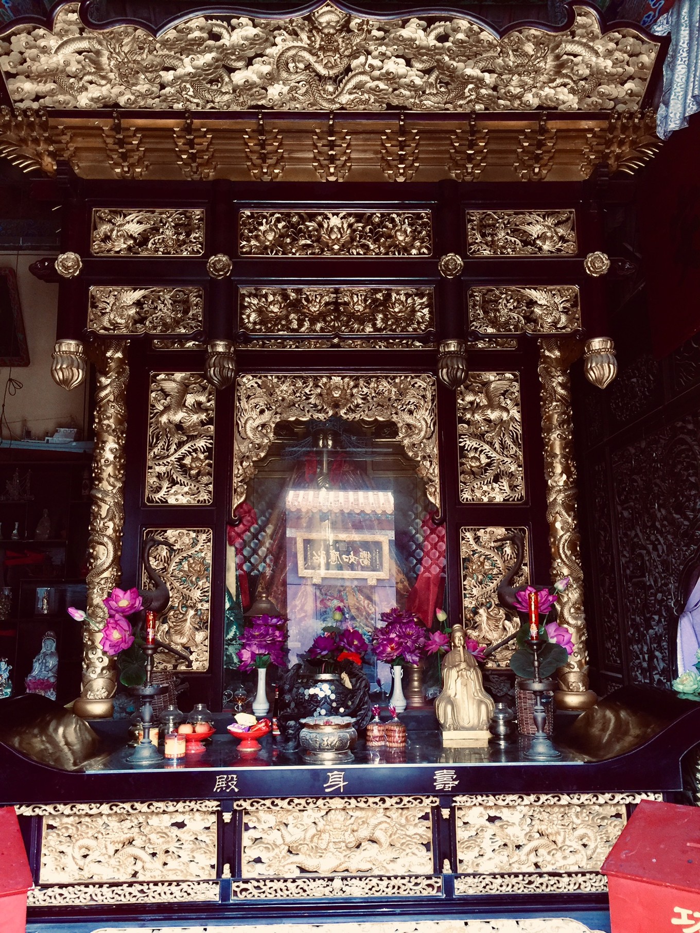 正中神龕內供奉著北宋宣和七年(公元1125年)的銅身媽祖像,國家級文物,為鎮(zhèn)宮之寶。神龕金璧輝煌,雕工精美。