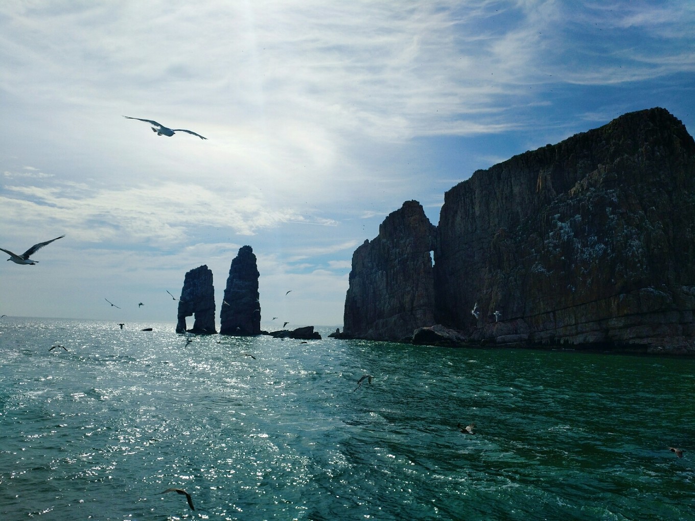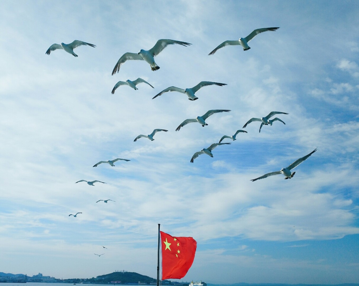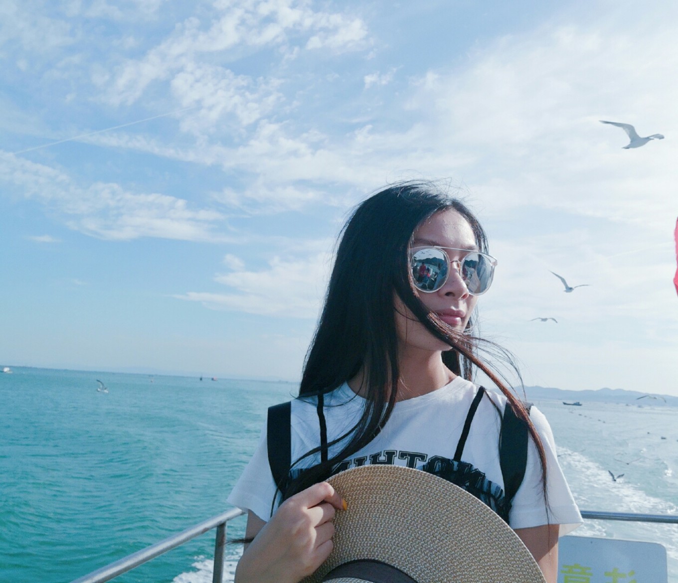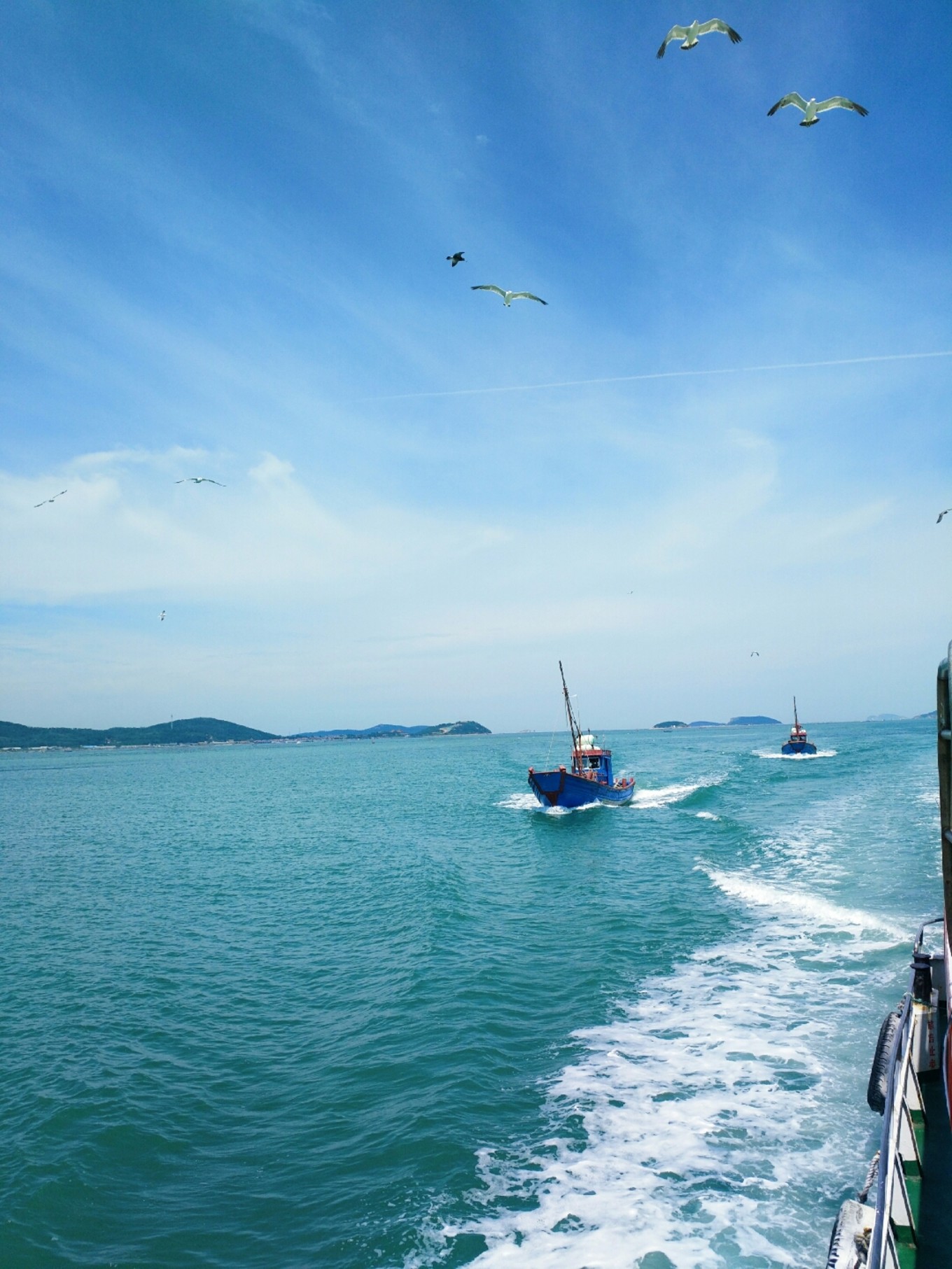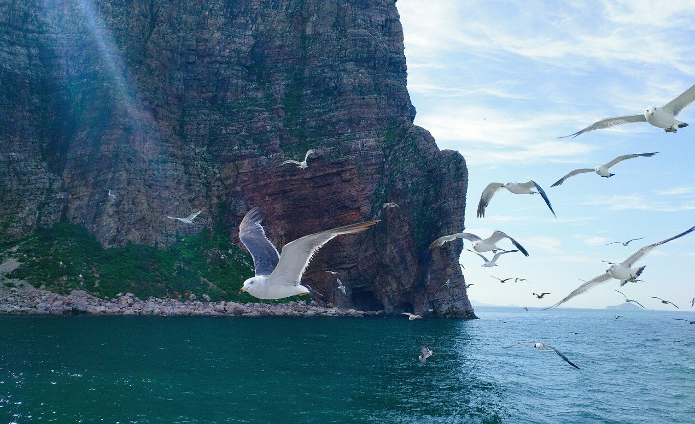 起航?jīng)]過多久就有成群結(jié)隊(duì)的海鷗跟著船盤旋了,等待著游客們的投喂,我們也帶了一包火腿腸,撕開后向天上拋出去,海鷗們一接一個(gè)準(zhǔn)兒,把火腿腸拿在手中伸向天空,一不留神就會被膽大的海鷗們叼走。