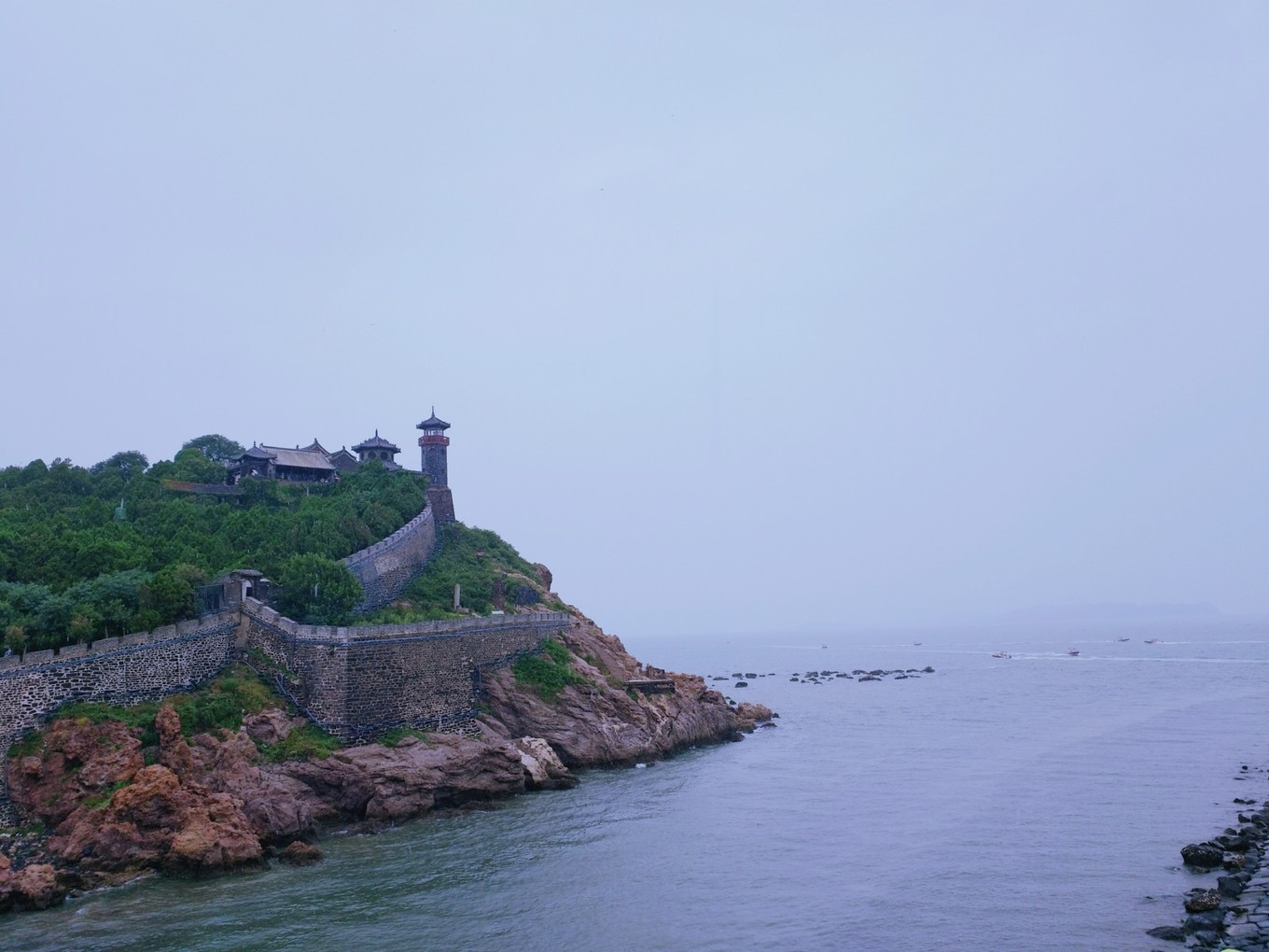 8:10吃完早飯我們就開車離開了,到達(dá)蓬萊閣是早上10:10,因?yàn)橄掠甑脑?,去往長島的船停航了,于是我們打算先玩玩蓬萊閣,導(dǎo)航導(dǎo)到蓬萊閣西門,停車場都是收費(fèi)的10元不限時(shí),在停車收費(fèi)那個(gè)人那里能買到比窗口優(yōu)惠一點(diǎn)的票,如果是學(xué)生票就去窗口買,半價(jià)70元/人能省不少,纜車是去田橫山頂?shù)?,沒多高走個(gè)10分鐘就到了,我們沒買票直接上去的。