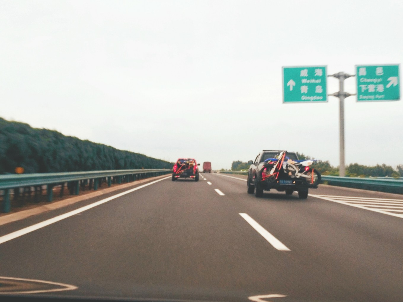 我們在服務(wù)區(qū)吃了35元/人的自助餐,休息了一下,14:05才從服務(wù)區(qū)離開。高速上陰晴不定,時(shí)不時(shí)就會有暴雨,幾分鐘后有晴了。這次在路上還遇到對面高速一輛大型貨運(yùn)卡車著火,老遠(yuǎn)就看見濃煙滾滾的,不敢放慢速度,快速通過危險(xiǎn)地段。后來又碰到兩輛北京的皮卡載著沙灘摩托,城里人真會玩,裝備都這么齊全,哈哈哈。