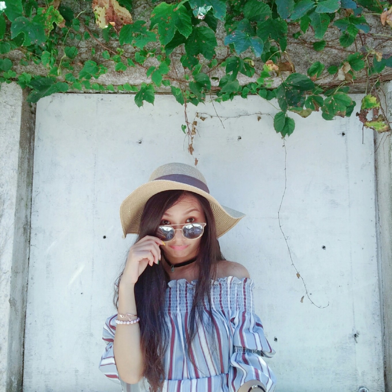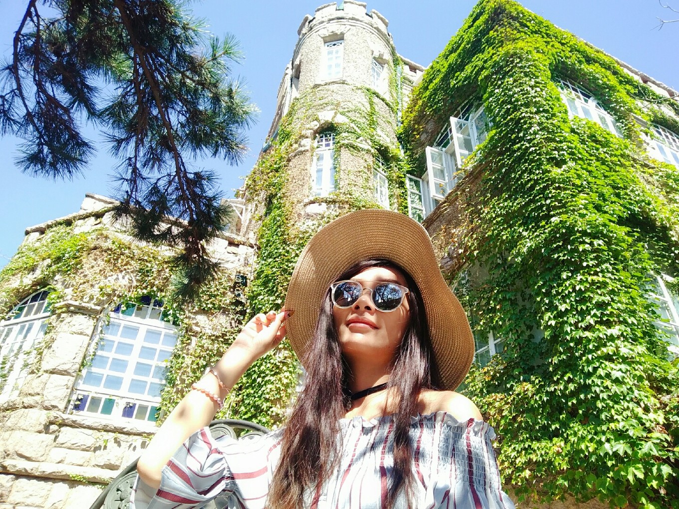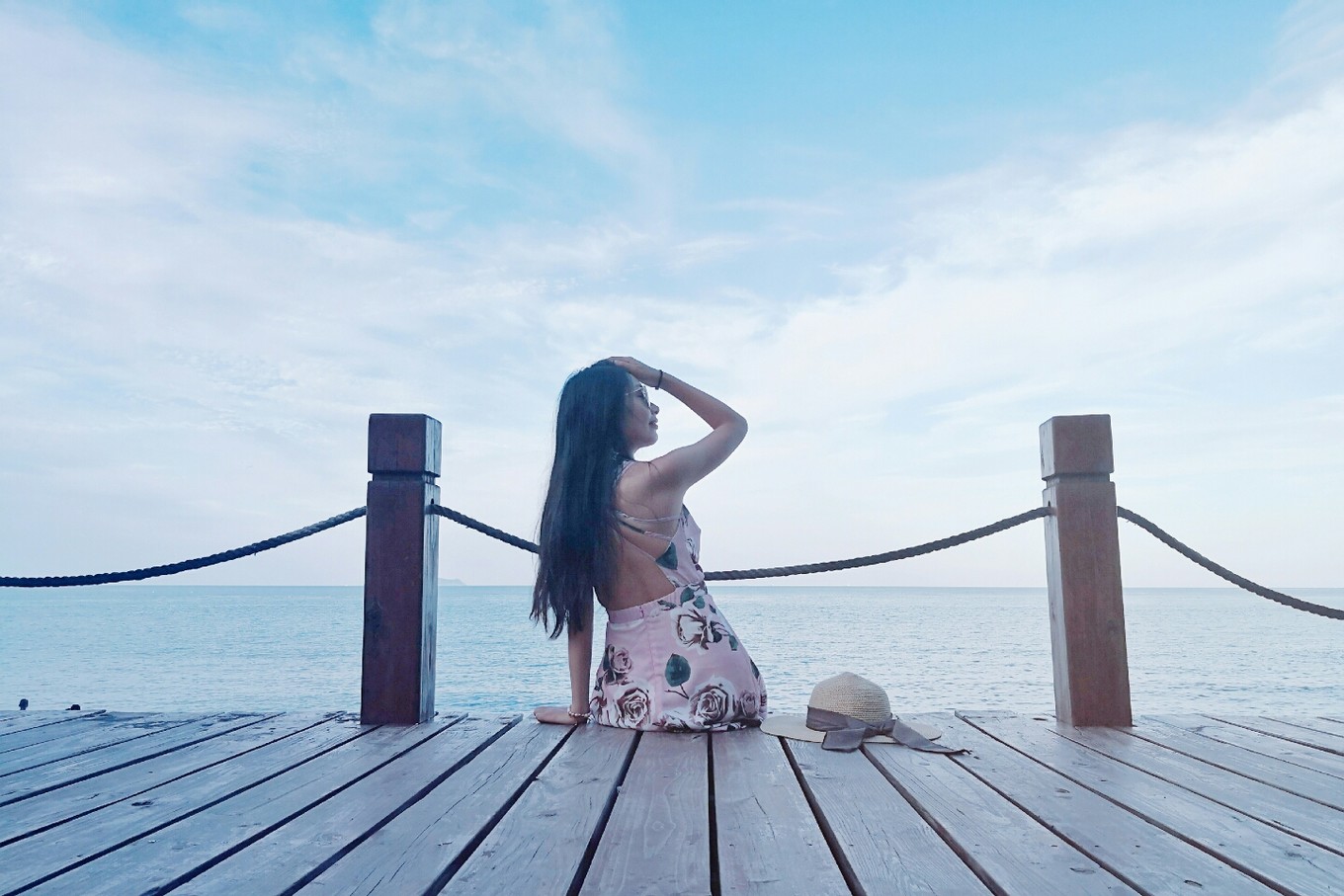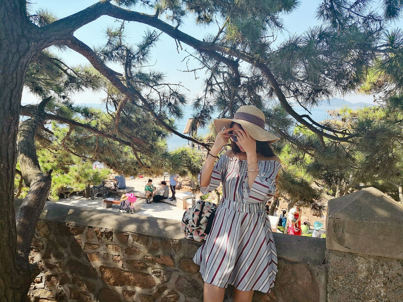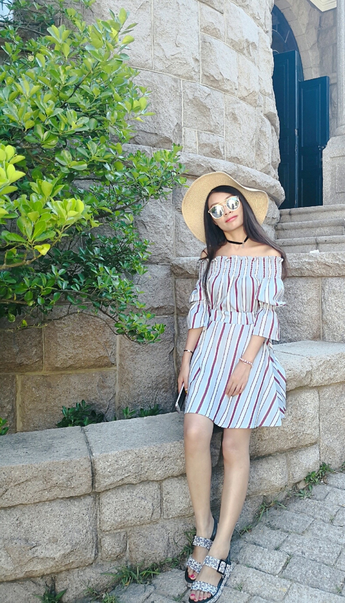 裙子不適合拍坐地照片,因?yàn)樘菀鬃吖饫?,哈哈哈,并且地上被太陽曬得真的很燙很燙。