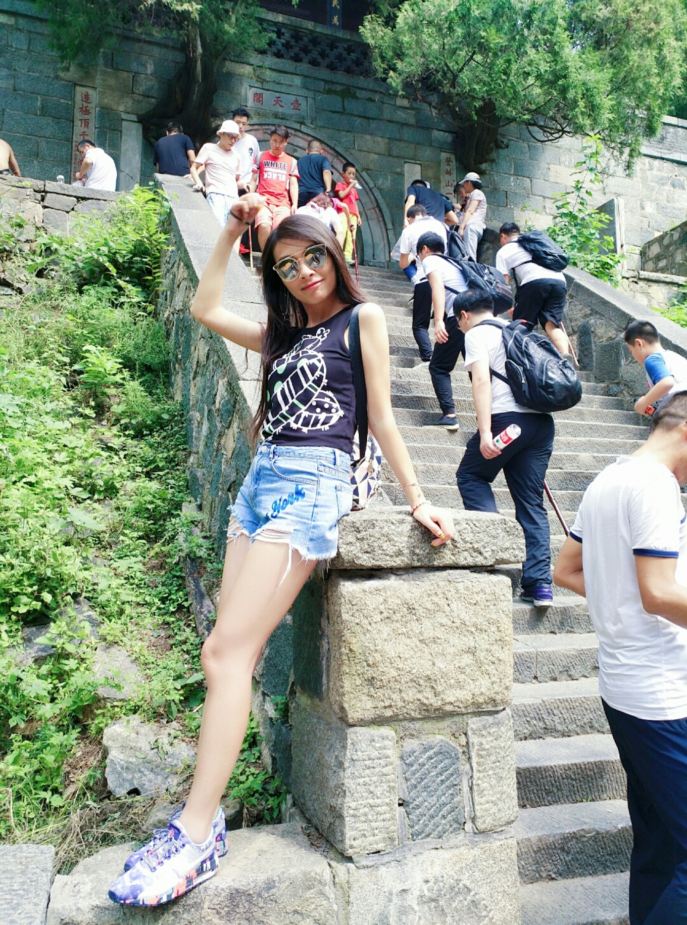 在上面轉(zhuǎn)了轉(zhuǎn),本來想著下去的時(shí)候坐纜車下去,然而纜車排隊(duì)的人多到無法想象,保安說預(yù)計(jì)我們能坐上纜車要等四五十分鐘,于是我們還是乖乖的走下了山。上山的時(shí)候大多時(shí)間都埋著頭在爬,不覺得有太陡,下山的時(shí)候才意識到陡,只能扶著樓梯兩邊的欄桿往下走。