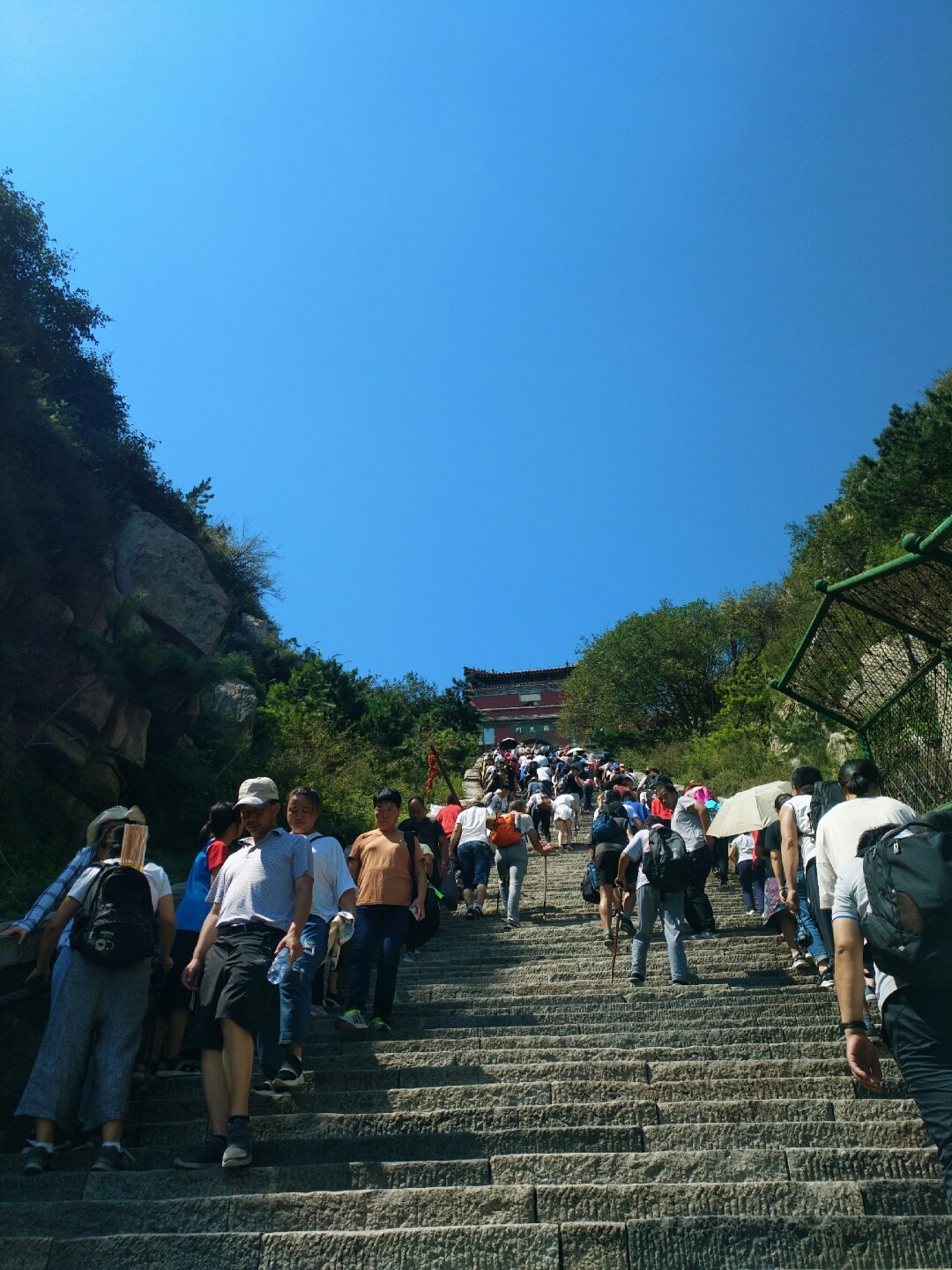 看下圖,山坳坳處就是南天門的位置。沒錯好多人看到之后都表示很絕望,但沒辦法還是要繼續(xù)往上爬,有個(gè)小朋友直接就哭了,邊哭邊走,嘴里還不停的哭著說不想走了,但還是跟著他媽媽一直往前走。
