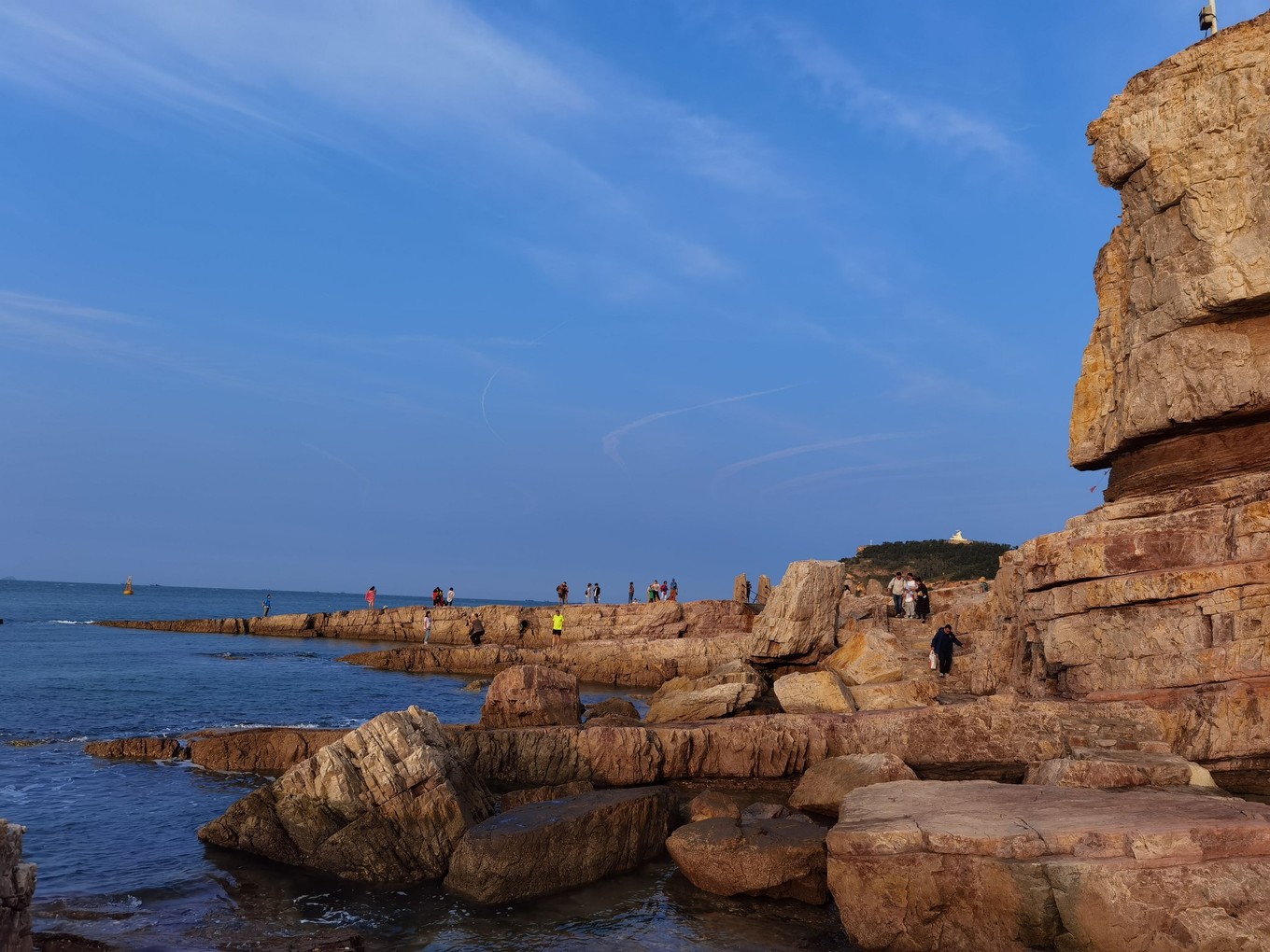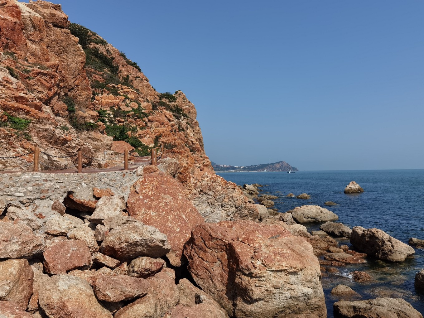 長島旅游最精彩的一幕,就是在九丈崖看日落,九丈崖有紅紅的嶙峋的崖石,走在海上棧道上看,有的像海豹剛躍出海面,有的像巨大的書卷在海岸矗立,紅紅的石頭,近看像雞血石一樣,又像常見的玉石一樣油浸浸的漂亮,海岸邊高聳的紅崖在斜陽下如火在燃燒,美得讓人震撼不已,怪不得景區(qū)門口有告示,這里的石頭是國家礦物資源,不得帶走,就像許多景區(qū)的海底的珊瑚一樣,是不允許帶走的。