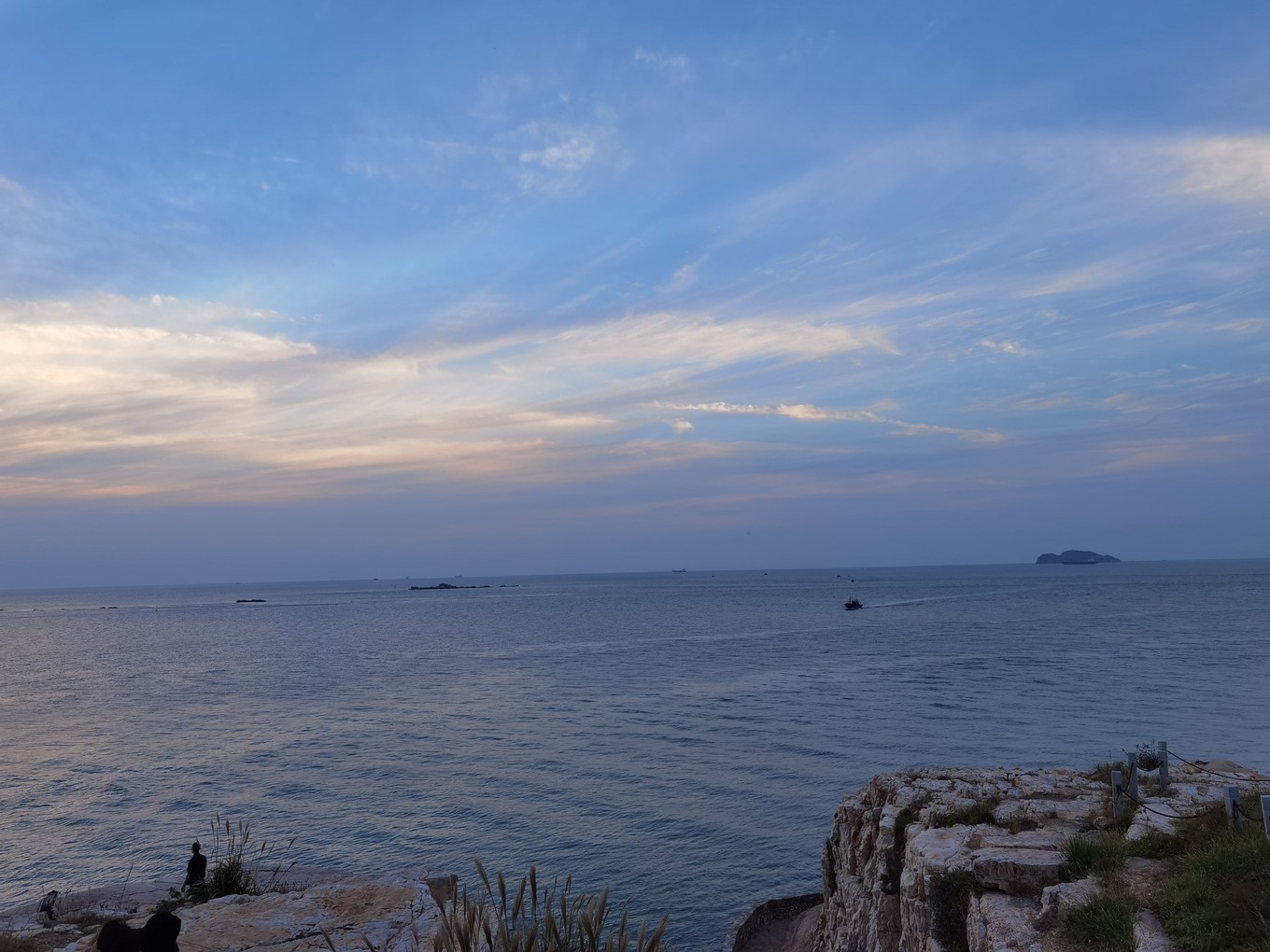 那時臺海形勢緊張,意識形態(tài)的對立造成人間的對立,互相仇視成為兩岸的主流,緊張的情緒彌漫著我們的世界,人們的心靈扭曲著,孩子的心理也扭曲著,那段烽火歲月是我們經(jīng)歷過的一段不平常歲月,當然,也預示著一種必然的會將悄悄地出現(xiàn)??唇裉欤缴系呐谂_已換裝成為游人的休息的地方,當年的烽火臺已修成了巨型飛翔的雕塑鷹,黃海與渤海的分界限在明媚的陽光下格外鮮明。眺望大海,