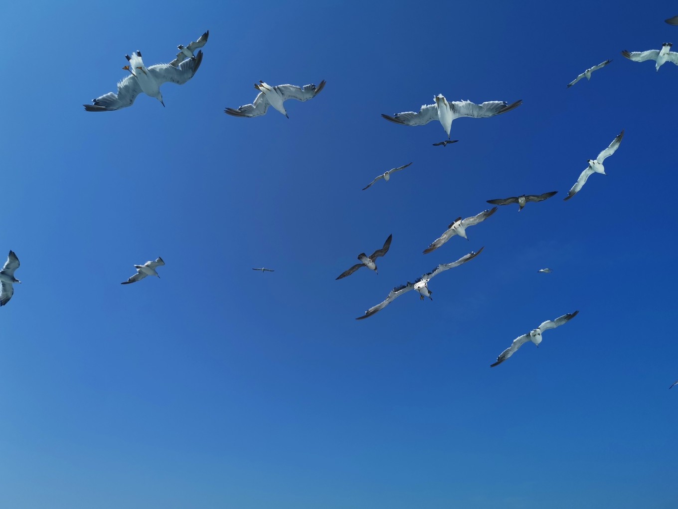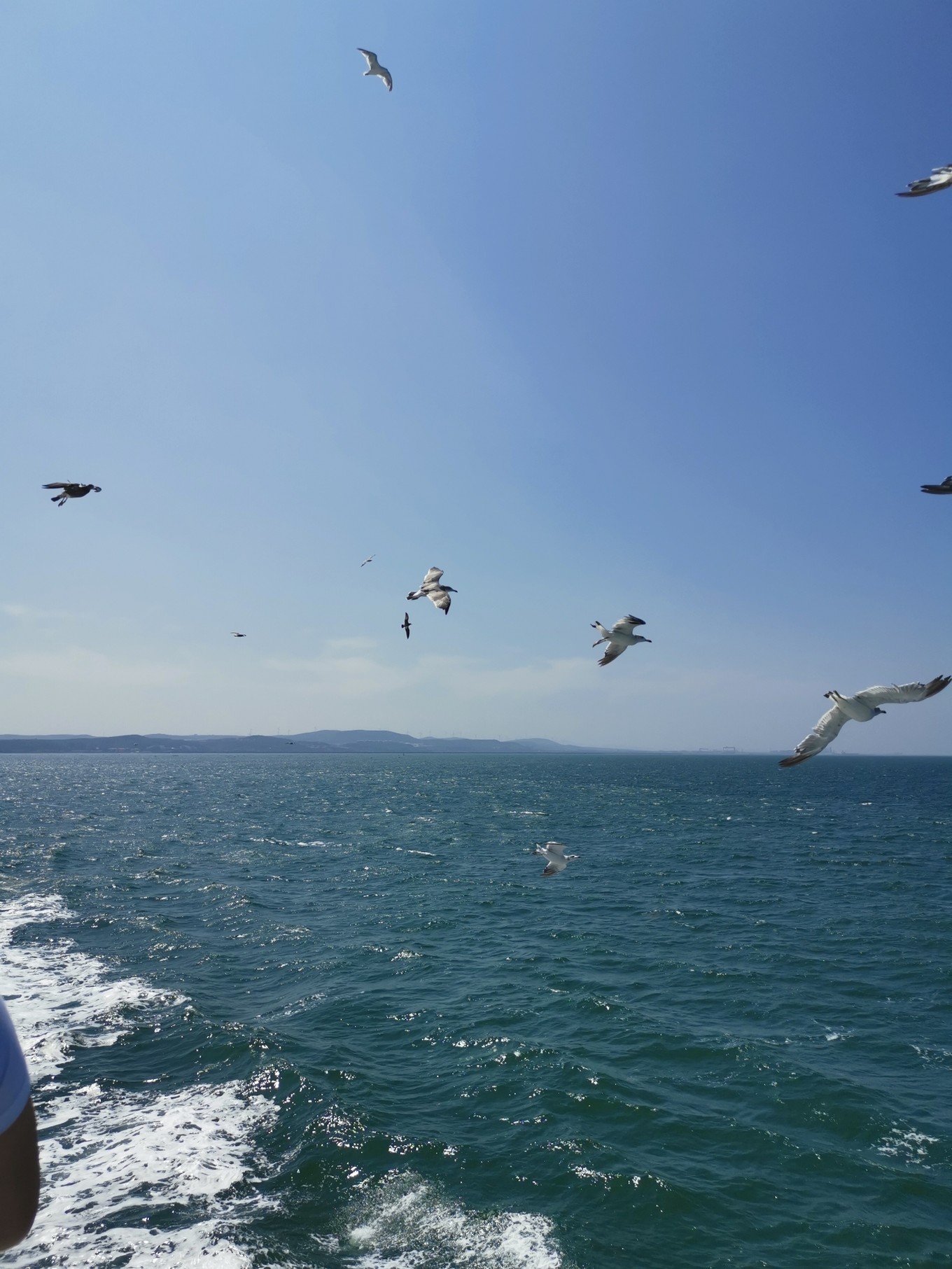 船一出海就有很多海鷗跟過(guò)來(lái),就我喂海鷗的經(jīng)驗(yàn),面包比火腿腸更受歡迎,大家可以準(zhǔn)備一包面包喂海鷗。