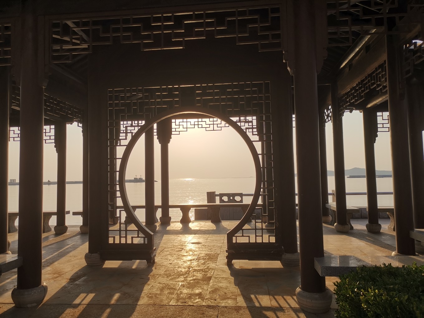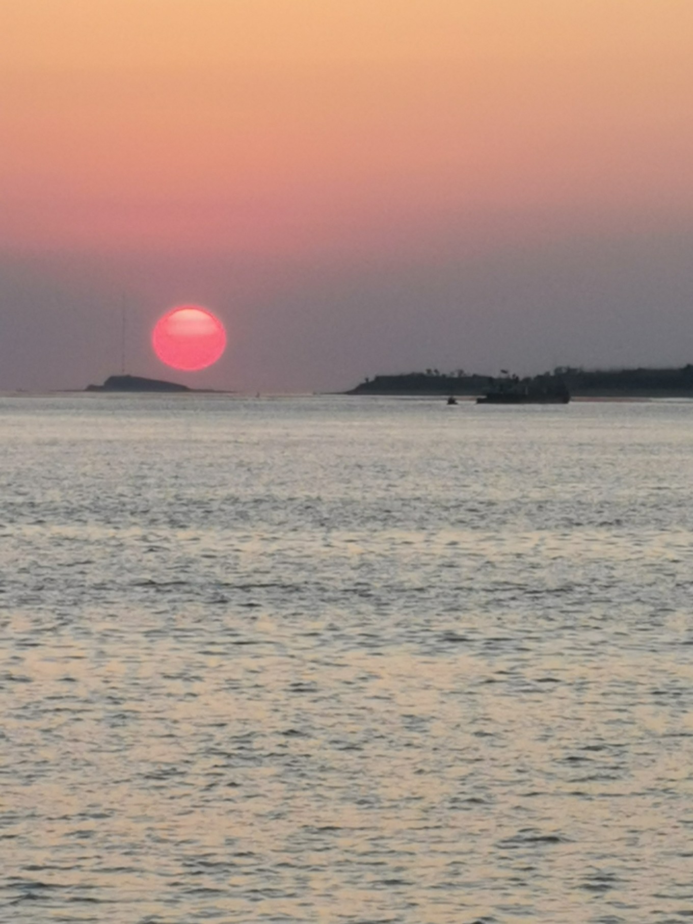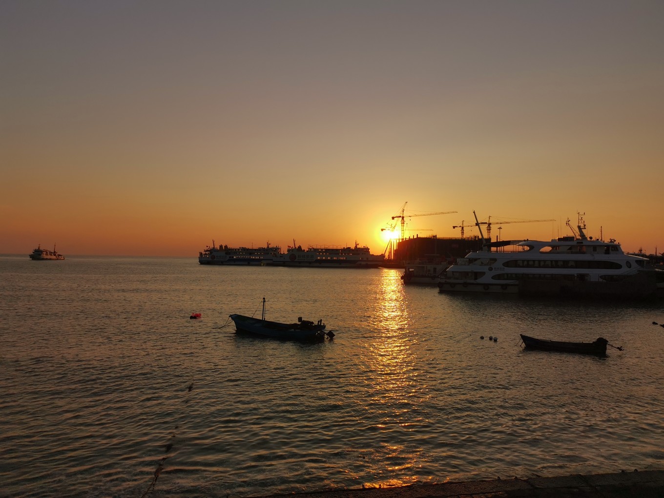 打車(chē)回到港口,旁邊有一條紅色的長(zhǎng)廊,那個(gè)地方特別適合等日落,輪船配著一抹圓圓的太陽(yáng),慢慢落下海平面十分有意境。