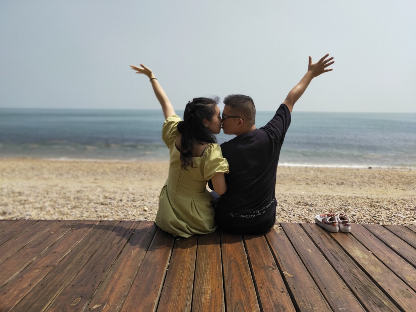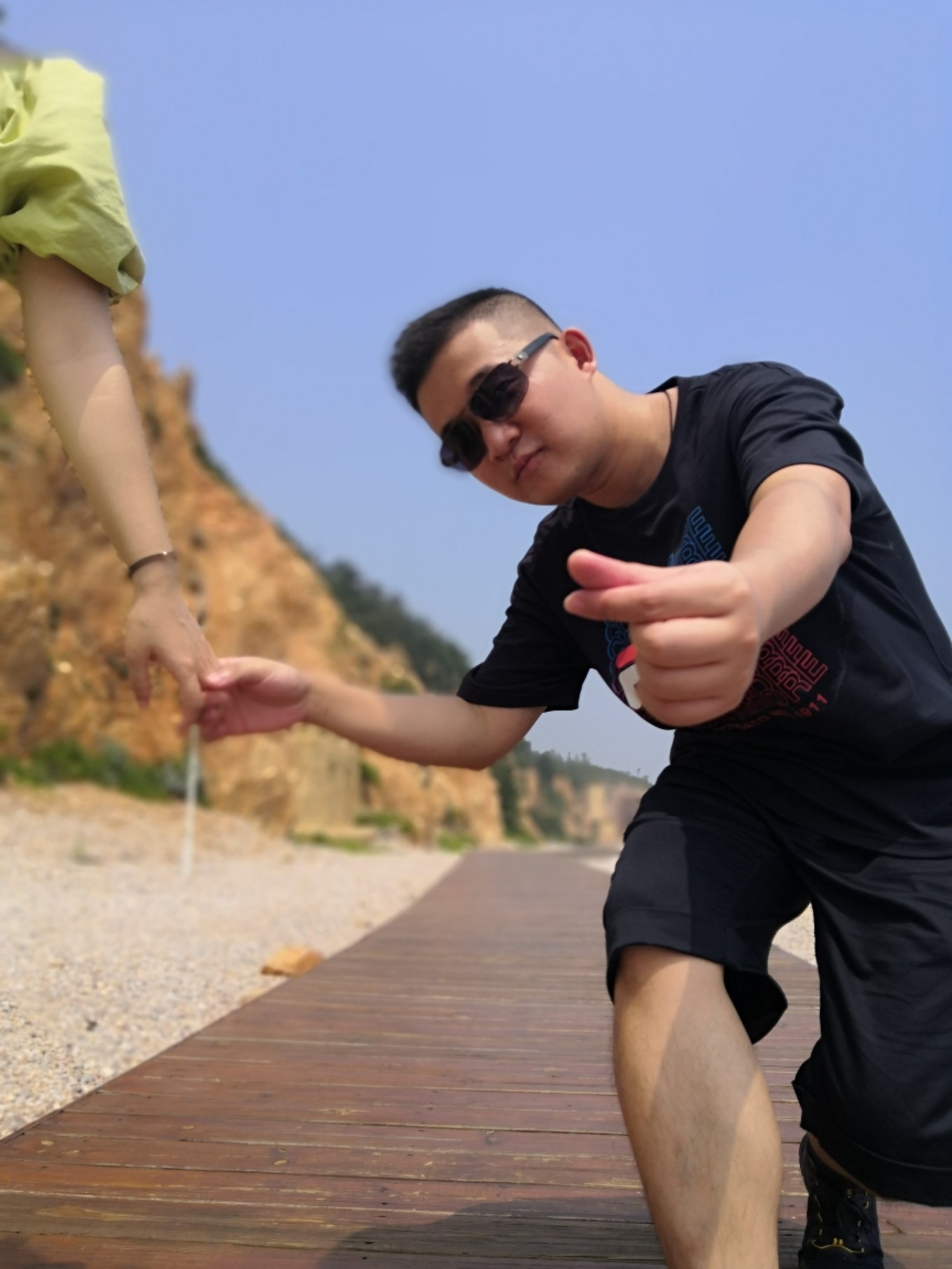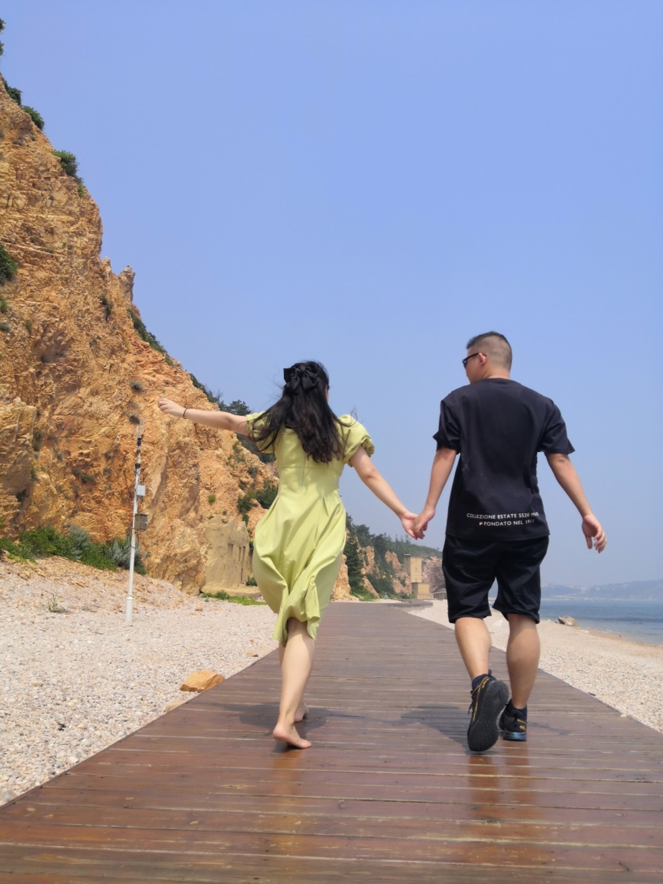 沿著海岸線,可以一直走到黃渤海分界線處,但因?yàn)槌彼€未退下去,所以看得不太明顯,走完玻璃棧道之后一路往上,就可以到黃渤海分界線的標(biāo)志物處,我們上去的時(shí)候太陽也已經(jīng)出來啦~艷陽高照!