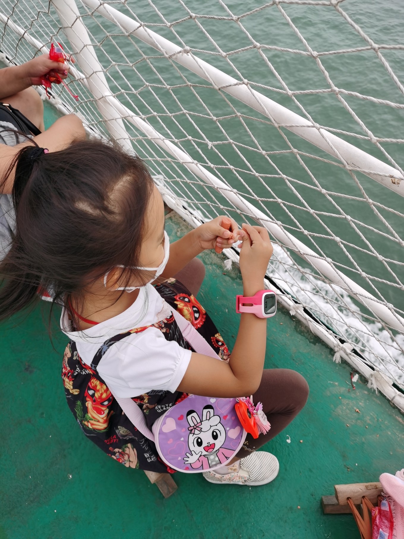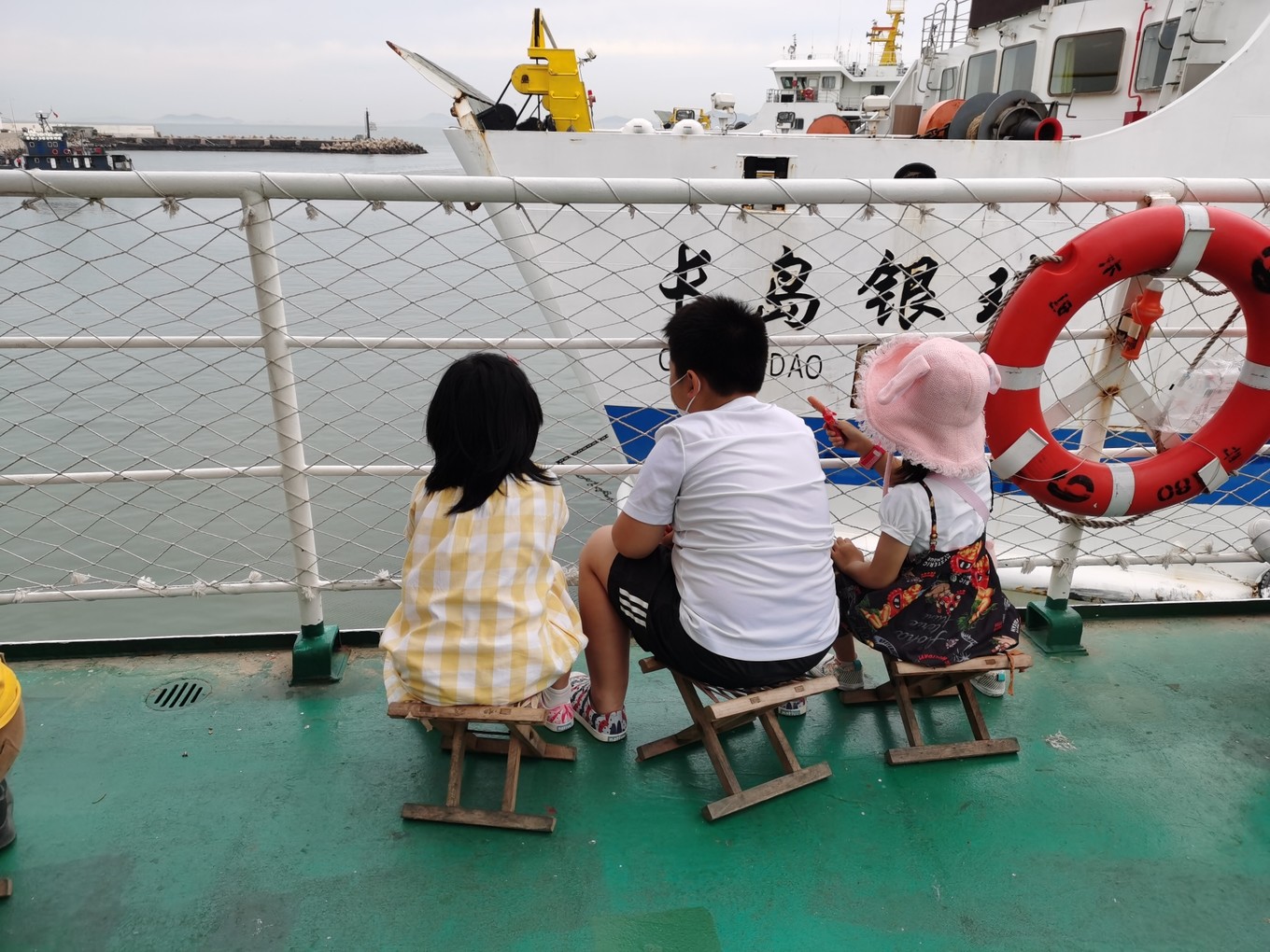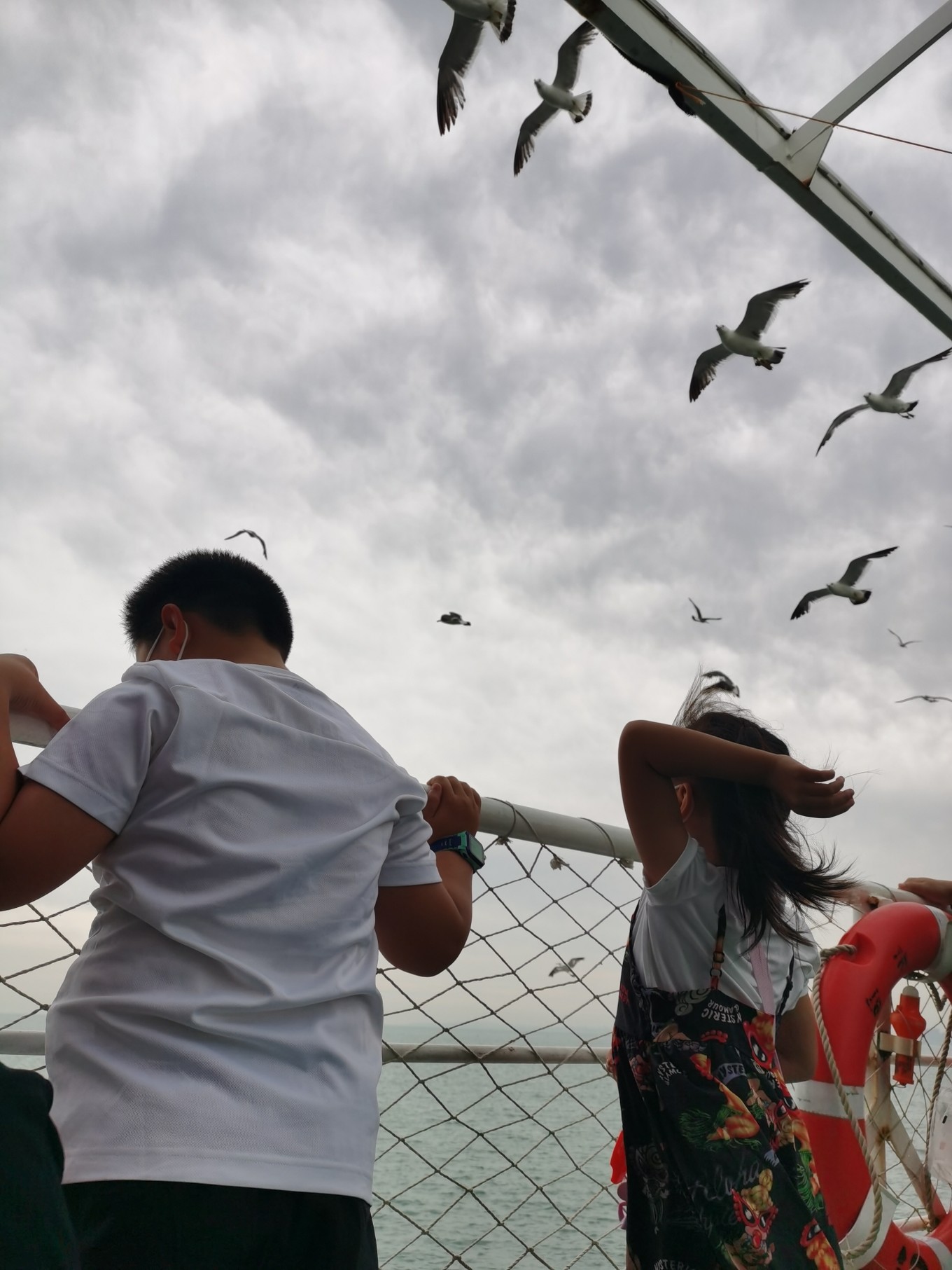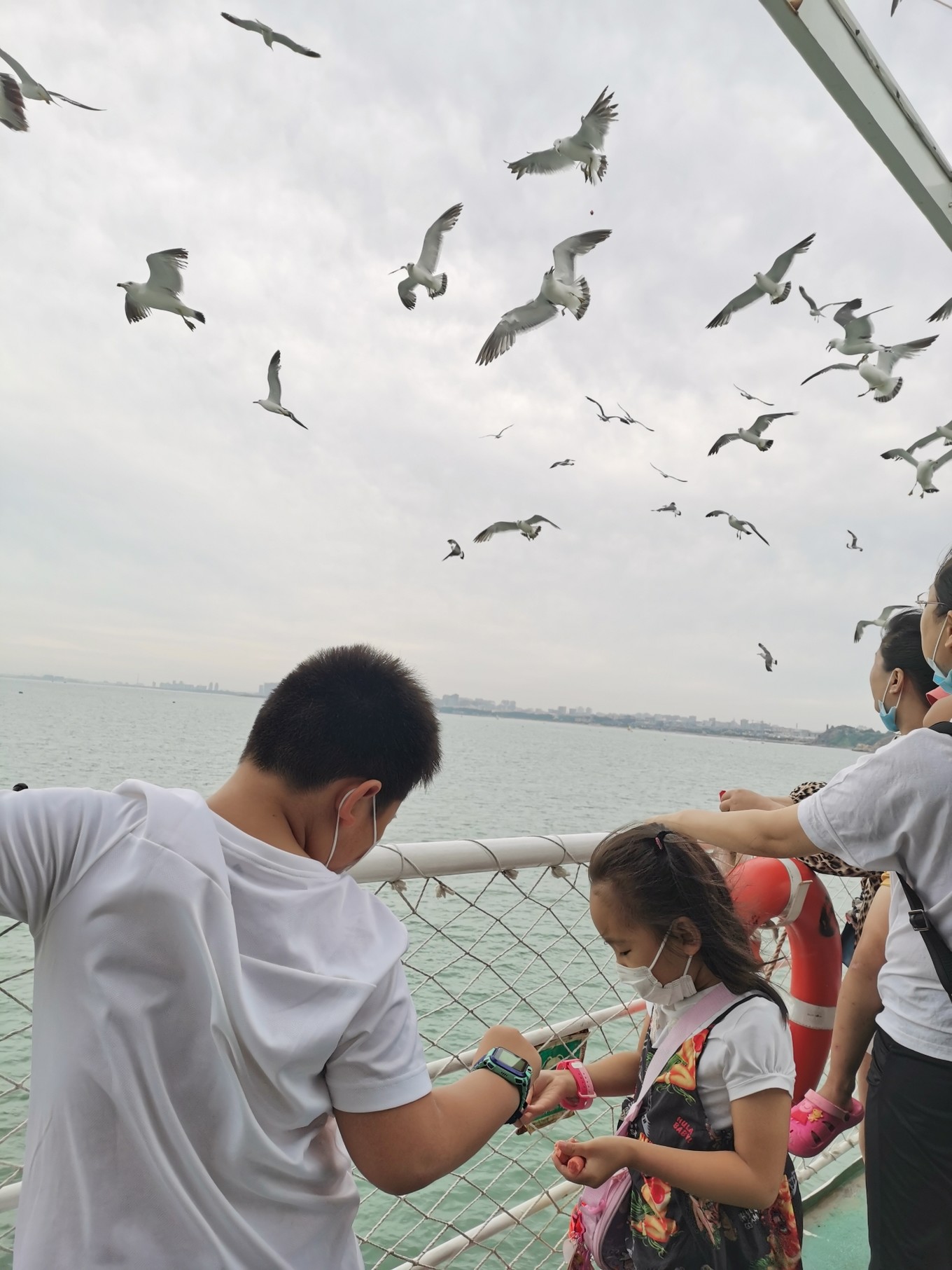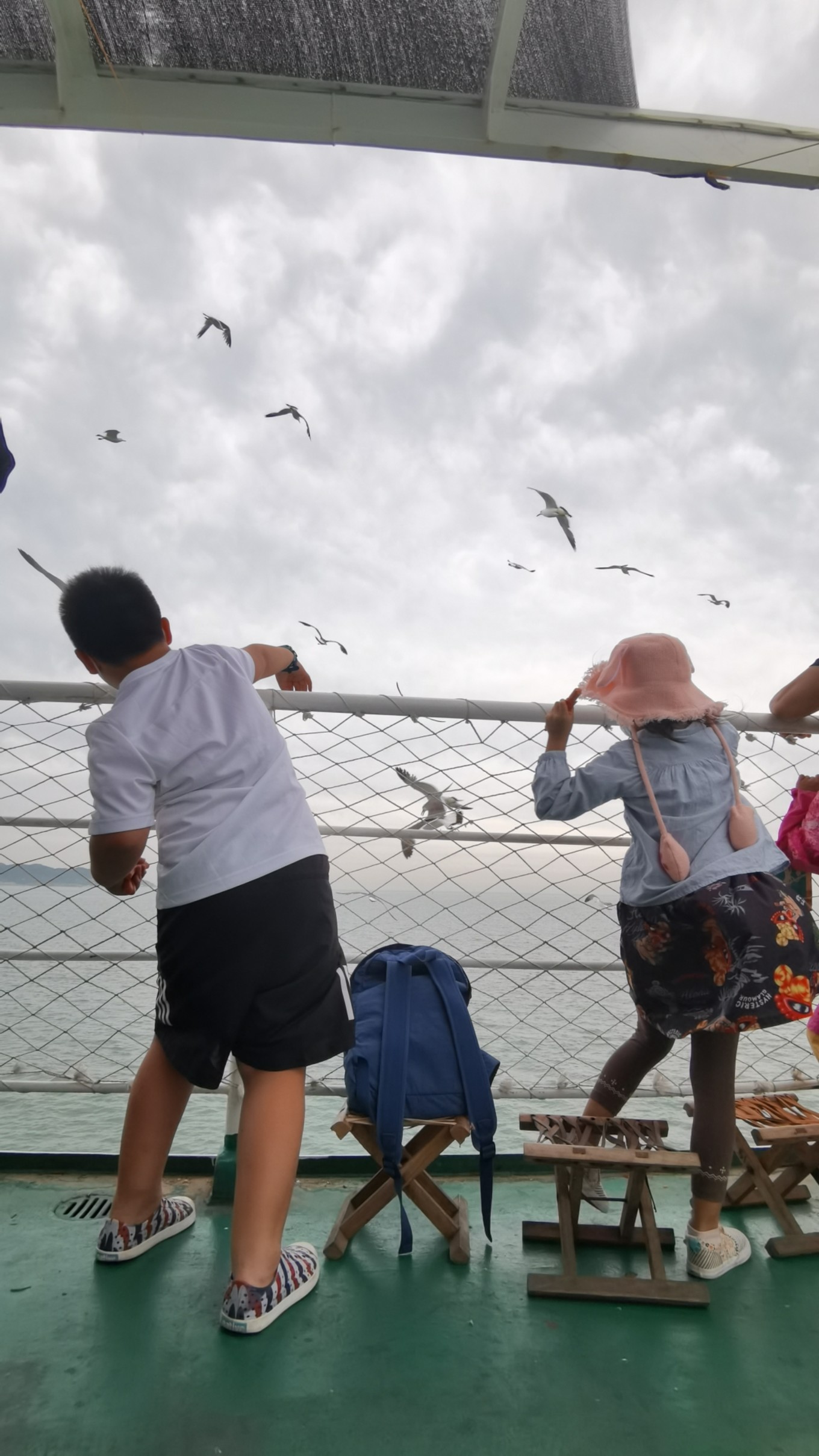 8點30的碼頭船做到長島,有些陰天,拿到一張舊船票上路,船票45一張,擦邊球1.2以下免費,半小時一個船次,我們跟幸運正好趕上,趕上尋仙80不算大船,不過到了二層我們加了一人20元(擦邊球1米18正好不收費)上了甲板給了火腿腸,上去喂可愛的海鷗了,整個40分鐘都在甲班上,還是穿個外套最穩(wěn)妥,看到海鷗們拋出去火腿腸準確接到,靈活的身姿還是很向往他們自由的翱翔