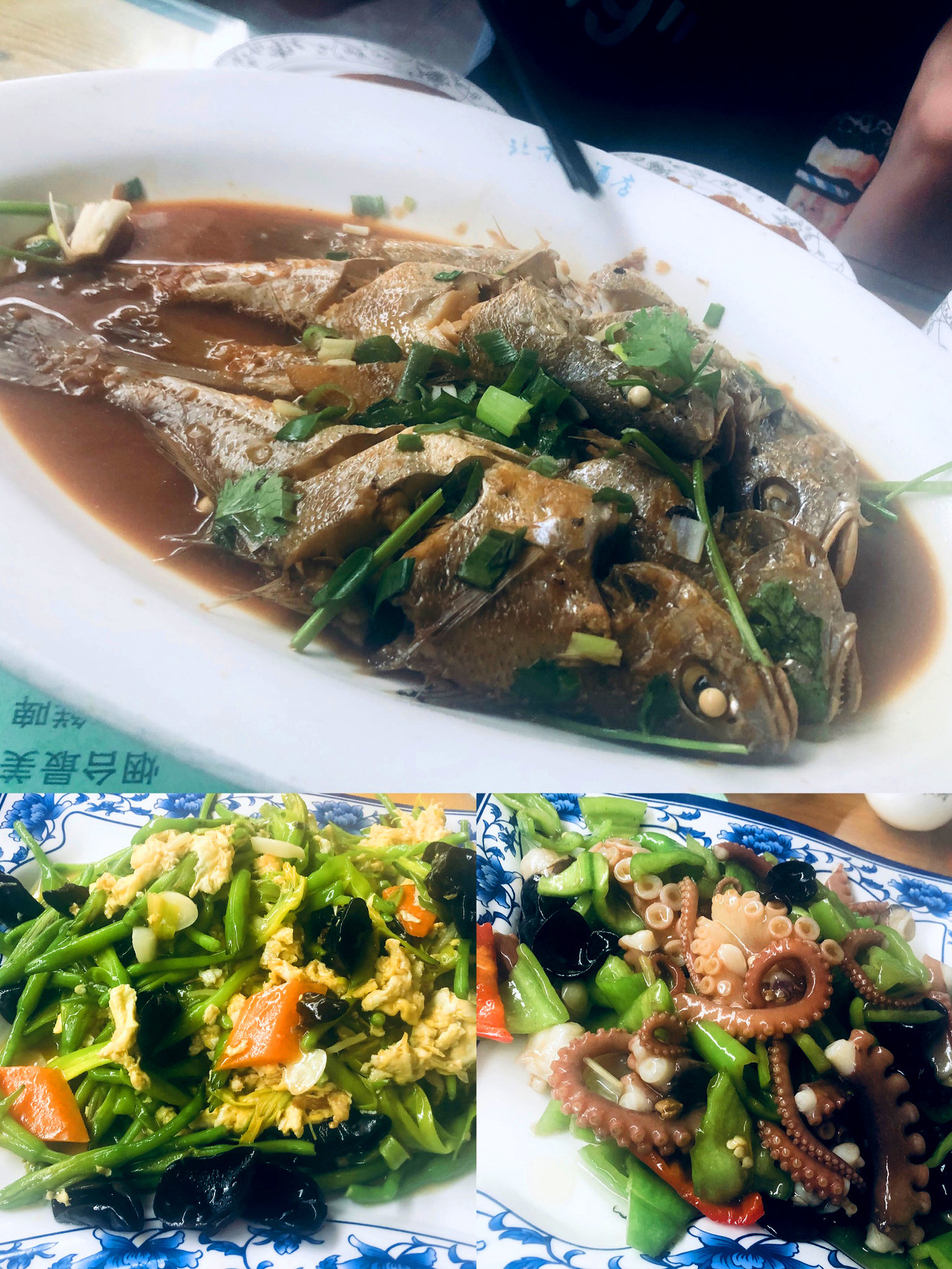 午餐:海灘游玩后步行到菜市街鵲嘴路海鮮市場(chǎng)自購(gòu)海鮮去加工,買(mǎi)了四條鮮海鯉子魚(yú),三只活八爪魚(yú)總共花了50元。去離市場(chǎng)比較近的渤海灣美食城(一家本地人常去的飯館),紅燒魚(yú)加工費(fèi)20元,八爪魚(yú)加工費(fèi)15元,點(diǎn)了一個(gè)黃花菜炒雞蛋38元.島上所有飯店的加工費(fèi)差不多。