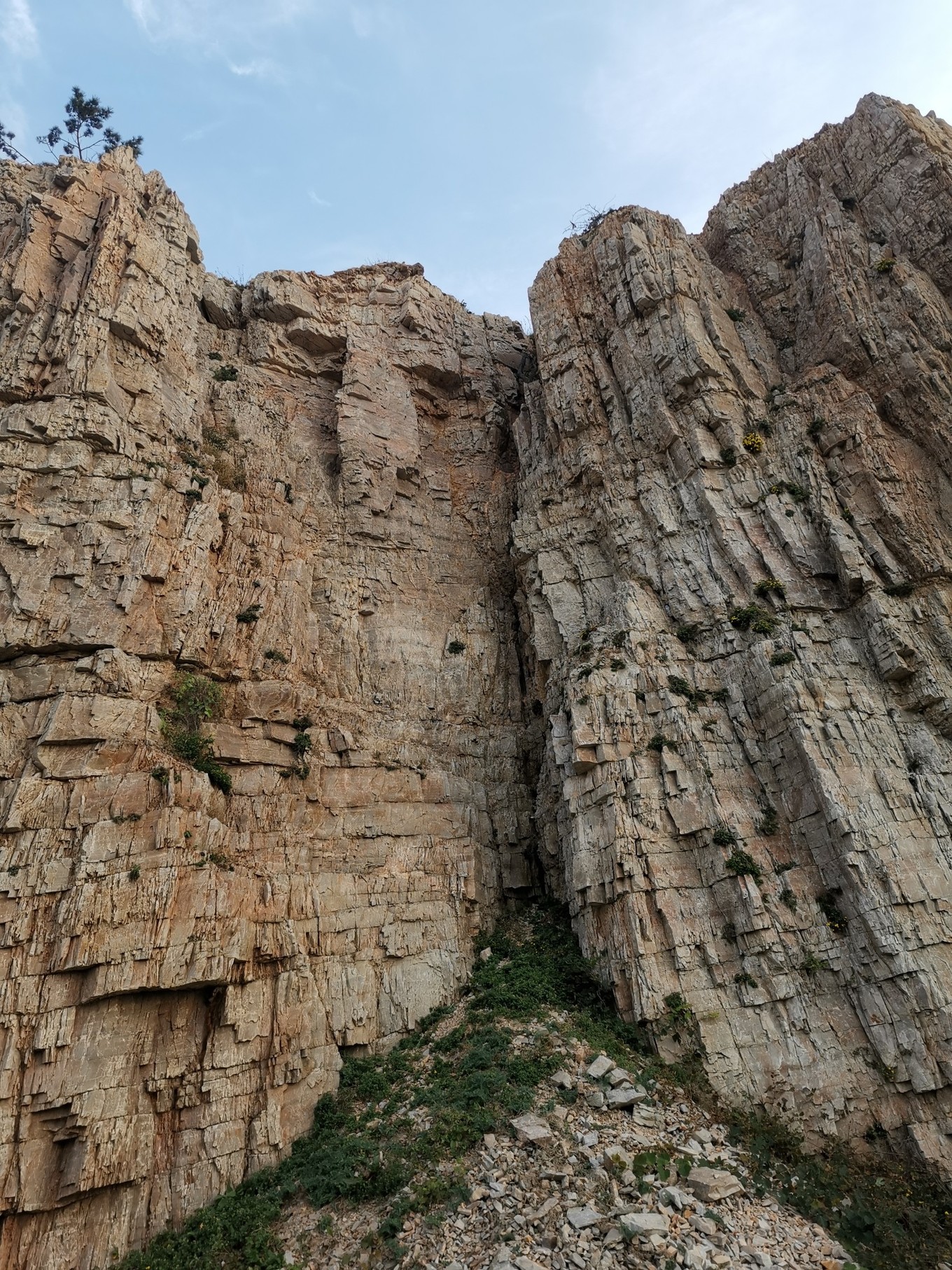 長長的木棧道,親海而建,在峭壁上的伊人冠,是絕佳的觀景臺(tái)。九丈崖因崖高且險(xiǎn)而得名,因?yàn)楹Ng作用,崖壁直立呈90度,堪稱國內(nèi)海邊獨(dú)一無二的景觀。仰望絕壁萬丈,不由得感慨大自然的神工。