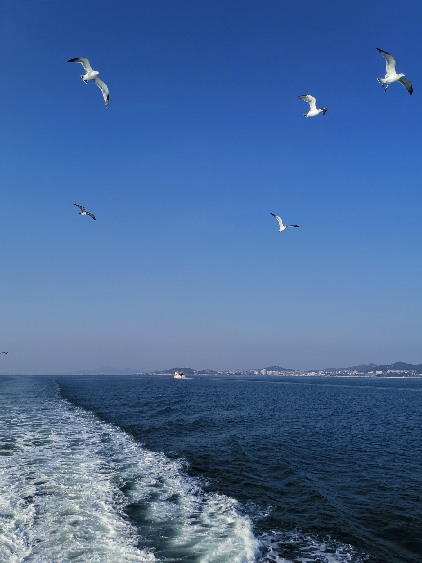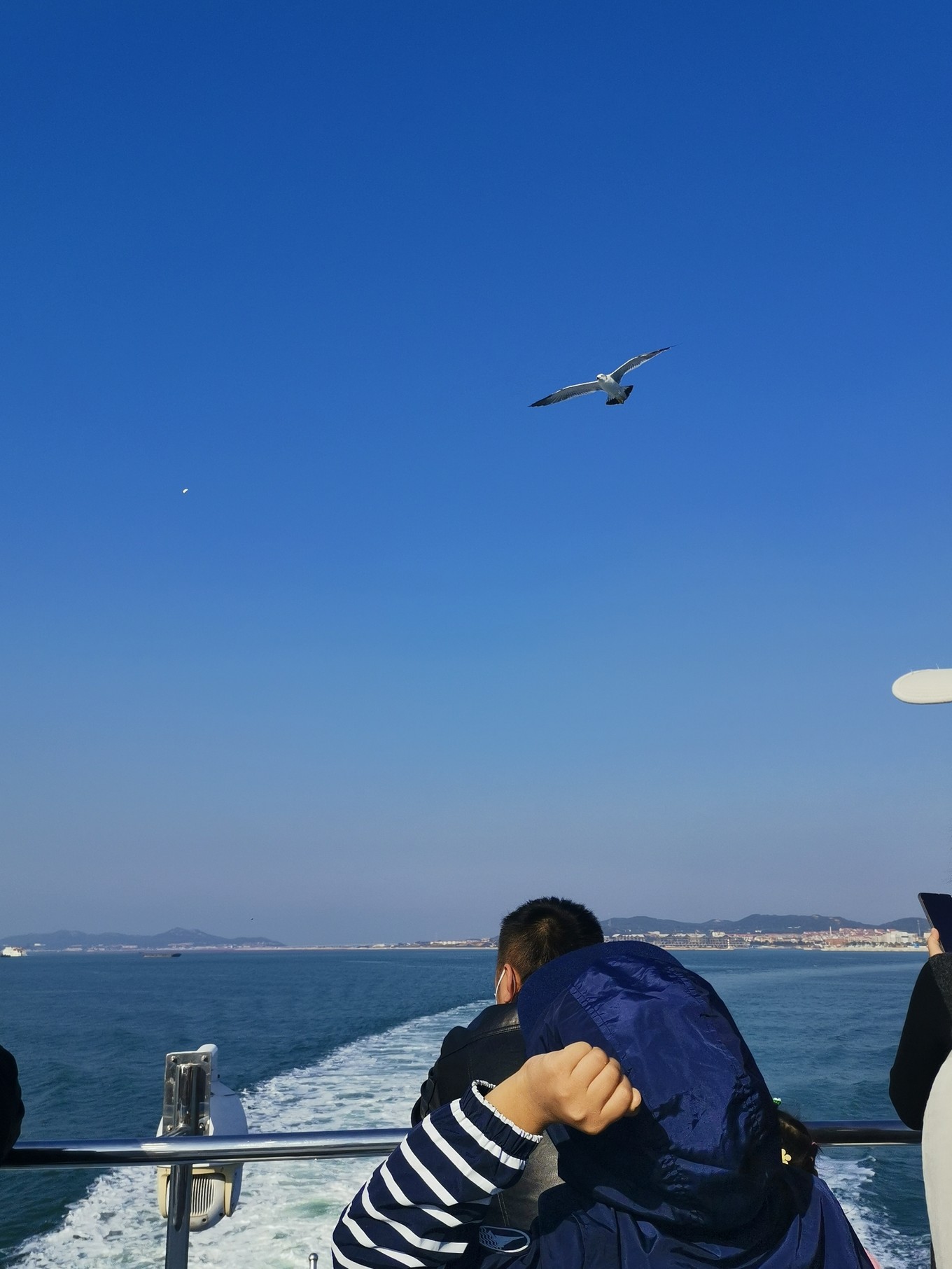 返程的船票預(yù)訂的是豪華客船觀光層,秋風(fēng)稍涼,如果是夏天或許更好。小朋友也加入了船尾喂海鷗的行列,45分鐘船行漸緩,很快就在蓬萊靠岸,我們要向長島說再見了,期待下一次相遇!