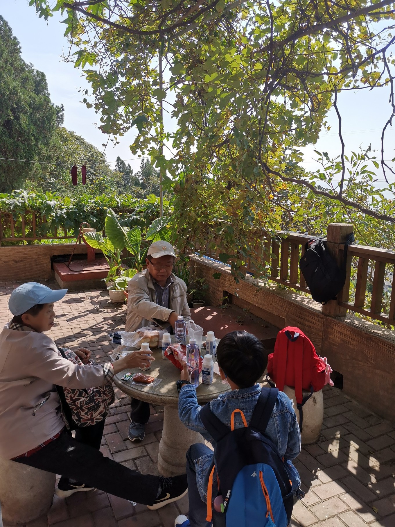 最巧妙的是山頂午餐,自備的面包牛奶和各種零食,因?yàn)榭鞓芬渤闪嗣牢?。圍坐在石桌椅前,有藤蔓半遮著陽光,尋找美好變得如此?jiǎn)單。