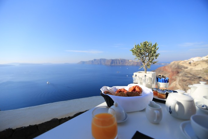 在最美的懸崖酒店醒來,看最藍(lán)的海。有人說去圣托里尼沒住過懸崖酒店,就算白去了。對著藍(lán)色的海吃早餐,實在是人生一大樂事。