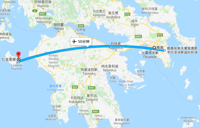 雅典直飛扎金索斯機(jī)場,約55分鐘。