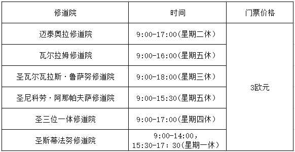 進(jìn)入修道院,請注意穿著,女士不可穿短裙,請穿長裙/長褲;男士不可穿短褲。上述修道院所列作息時間為夏季(01/04至31/10),冬季一般會提前關(guān)門。