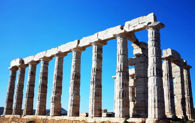 波塞冬神廟,是祭祀古希臘神話海神波塞冬的古典建筑,它位于雅典東南邊、阿提卡半島最南端的蘇尼翁角(Cape Sounion),距離雅典約70公里。由于時間很長,神廟只剩下殘垣,只有12根柱子,矗立在約65米高的懸崖上。