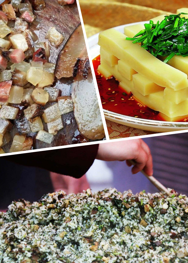 【社飯】是銅仁的一種吃食,以青蒿入味、將煮熟的糯米和大米混合、放入臘肉丁、苦蒜、蒿菜、鹽、味精拌勻后蒸熟即可。社飯吃起來(lái)青蒿野蔥味馨香,臘肉香味濃郁,米飯油而不膩,特別可口。