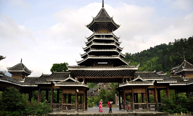 吊腳樓下方的水塘里養(yǎng)了許多魚,鼓樓散布在寨子中間。說到鼓樓,它是侗族人的標志,承載了諸多功用,集會事、休閑社交、接待來客等。造型精美,八角攢尖頂,最多十三重檐,外形像一座寶塔。站在鼓樓內仰望,內部錯綜復雜,據(jù)說全以木榫穿合不置一釘。隨意落在路邊的灶臺和大鍋,有些年代的風雨橋,以及四面透風的原生態(tài)茅廁,異域風情滿滿。