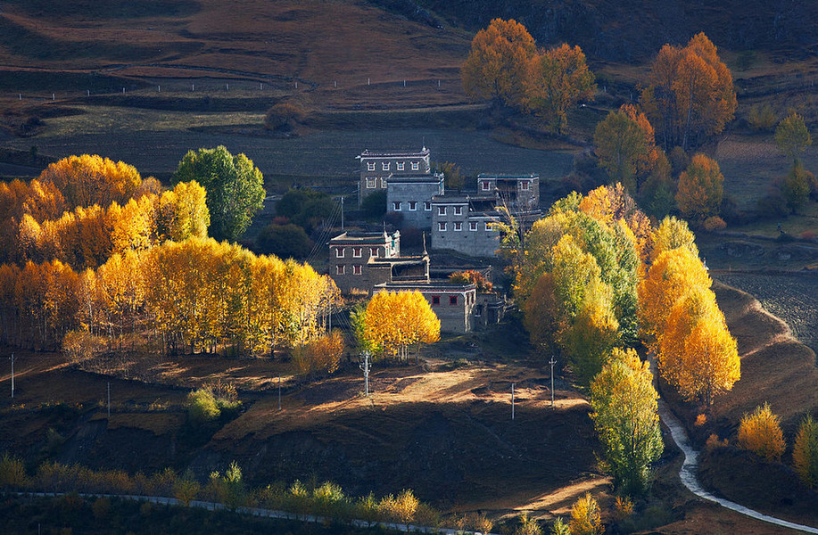 在新都橋,最好的光線出現在早上或者黃昏,站在村頭的山坡,整個河谷盡收眼底,你會看到清晨第一縷陽光恰如其分的打在村子里,或是黃昏最后一縷陽光從遠處慢慢移走。天空有云的時候,會有精彩的局部光精巧地打在村舍、楊樹或坡地上,這就需要你的瞬間反應了。