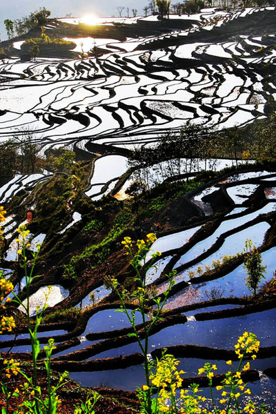 梯田每個(gè)季節(jié)都有不同的景色,但是觀賞梯田的最好的時(shí)間是在每年的11月到第二年的3月,因?yàn)樘萏镌谇锸蘸笠酀M水保養(yǎng),這個(gè)時(shí)候看梯田層次感很強(qiáng),美得令人窒息,很多專程來元陽拍攝梯田的攝影師都會(huì)選擇這個(gè)時(shí)間段來拍攝。其中春節(jié)前后更是經(jīng)??梢娫坪#昂?,野櫻花、野木棉花、野桃花和棠梨花開得滿山的紅、白色,極為壯觀。