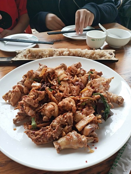 觀賞元陽梯田后又嘗口梯田鯉魚,可謂是大飽眼福、口福。梯田是養(yǎng)魚的好地方,因水是流動(dòng)、清澈的,在這樣的條件下養(yǎng)出來的魚光滑柔軟、肥胖、其肉質(zhì)細(xì)嫩、骨酥、味甜。酸筍煮魚,便是一道難得的佳肴。